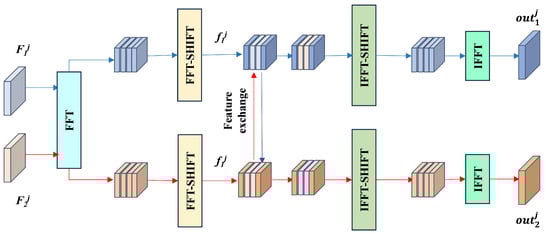 The specific process is shown in Figure 4. First, the bitemporal features are subjected to an FFT to convert the features to the frequency domain. To facilitate the exchange of low-frequency components, a centering operation—FFTSHIFT—is used to shift the low-frequency components to the center position. Then, the positions to be exchanged are defined. The position we chose was a square region with a length of 1 at the center of the feature map. Then, using the inverse centralization operation—IFFTSHIFT and IFFT—the features were transformed back to the spatial domain. The bitemporal characteristics are represented by , and the FFT formula is shown in Equation (1):