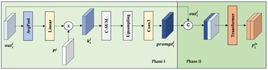 Feature prompt matrices serve as learnable parameter matrices, achieving dynamic enhancement through cross-channel interaction with input features. After concatenation with the feature matrix, the prompt matrix undergoes global modeling via the transformer, thereby playing a prompting role in enhancing the feature of . The bitemporal feature is . The main MSFEM formulas are shown in Equations (5) and (6):