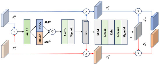 To address the issue of coupling significant and insignificant features in multiscale enhanced features—where enhanced multiscale features contain a large amount of redundant information—we designed the MSCPM, whose core architecture is shown in Figure 7. The MSCPM employs a cross-scale parameter sharing mechanism, generating a global modulation vector through a gated, fully connected network. This vector acts on the features of each scale to suppress the information irrelevant to the change while maintaining the consistency of the features across time and scales. The module consists of a spatially aware unit and a channel-aware unit, both of which utilize a dual-path attention mechanism for feature selection.