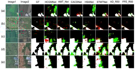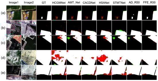 - HCGMNet [41]: A layered convolutional guidance network is used, employing a multi-scale feature fusion strategy and a change guidance module to enhance edge feature expression capabilities.