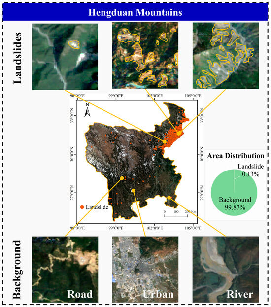 The Hengduan Mountains, as shown in Figure 1, are characterized by rugged terrain. Frequent seismic activity and significant climatic variability make it highly susceptible to landslides and debris flows. It is widely recognized as one of the areas with the highest geological hazard exposure in China [49,50]. The landslides across the Hengduan Mountains show diverse shapes and sizes due to the vast spatial extent. The background is characterized by complex features comprising 23 distinct land cover types [51], such as bare soil, roads, and urban buildings, which exhibit similar spectral properties to landslides and make it difficult to reliably distinguish true landslide occurrences.