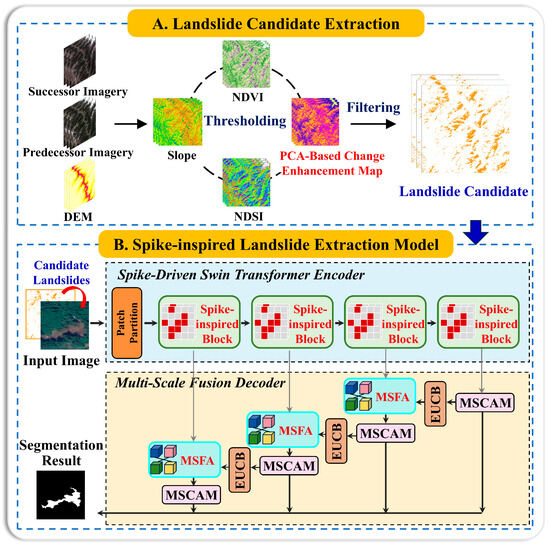 Overall framework of the spike-inspired landslide extraction framework.