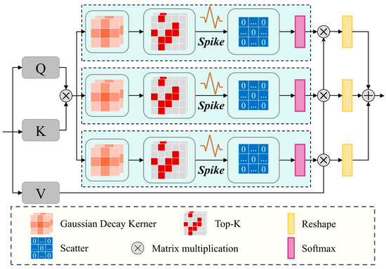 To overcome these limitations, the proposed SISA module implements a Spike-inspired adaptive spatial suppression mechanism, which is realized through three synergistic components that redesign the standard attention structure, as illustrated in Figure 5. First, inspired by the local information accumulation in spiking neurons, a Gaussian decay kernel is applied to strengthen attention locally and guide the model to focus on landslide regions. Second, a Top-k sparse activation attention simulates sparse neural activation to emphasize most salient landslide feature responses while filtering out weak background noise [57]. Finally, a multi-scale response fusion mechanism integrates outputs from multiple sparse attention branches to enhance the model’s representation of landslide regions.