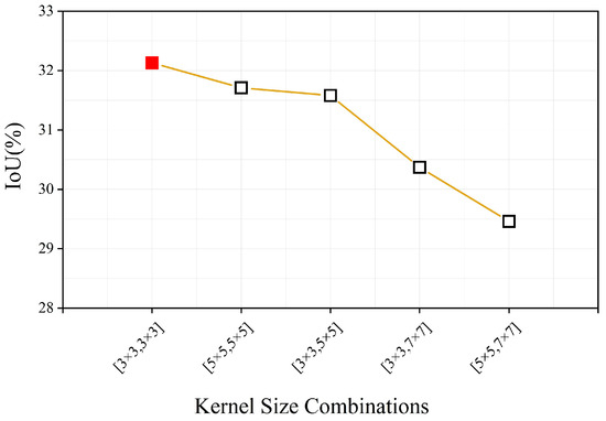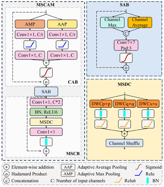 Multi-scale convolutional attention module (MSCAM): At each decoding stage, the features are first refined by MSCAM [59] to enhance landslide features across spatial scales. As shown in Figure 6, MSCAM integrates three components. The channel attention block (CAB) highlights channels most discriminative for landslides, improving feature selectivity. The spatial attention block (SAB) emphasizes salient spatial regions while suppressing background noise. The multi-scale convolution block (MSCB) applies parallel convolutions with different kernel sizes to expand receptive fields and improve sensitivity to landslide boundaries and textures. Together, these components generate rich contextual features for accurate extraction of complex landslide regions.