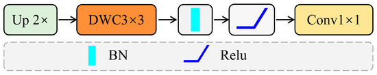 Efficient up-convolution block (EUCB): To restore spatial resolution and align features for skip connections, an Efficient up-convolution block (EUCB) is introduced at each decoding stage, as shown in Figure 7 [59]. The module first upsamples the feature map, refines it using a 3 × 3 depthwise convolution, and uses a 1 × 1 convolution to match the channel dimension with the encoder feature. This process restores resolution and enhances local continuity, providing semantic compensation that improves structural reconstruction and detail recovery in the decoding phase.