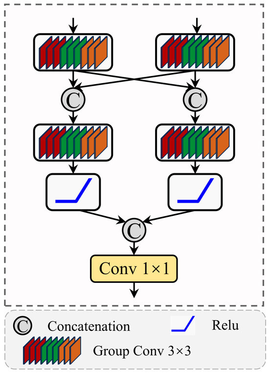 Mix-Scale feature aggregation module (MSFA): The MSFA is proposed to fuse cross-level features to combine semantic and structural information from multiple layers, as illustrated in Figure 8. Specifically, the MSFA module processes two input feature maps from different decoding levels, comprising a high-level semantic feature with lower spatial resolution and a low-level structural feature with finer spatial detail. Both input feature maps are first processed by separate 3 × 3 group convolutions to preserve the distinct patterns of each level and maintain feature distinctiveness, then concatenated across layers to enhance cross-scale interaction. The fused features are subsequently passed through another 3 × 3 group convolution and ReLU activation to refine joint representations. After a final concatenation, a 1 × 1 convolution is applied to generate the output. By explicitly combining deep semantic features with shallow structural details through this hierarchical fusion, the MSFA module strengthens contextual understanding of landslide regions and mitigates detail loss from earlier sparse encoding.