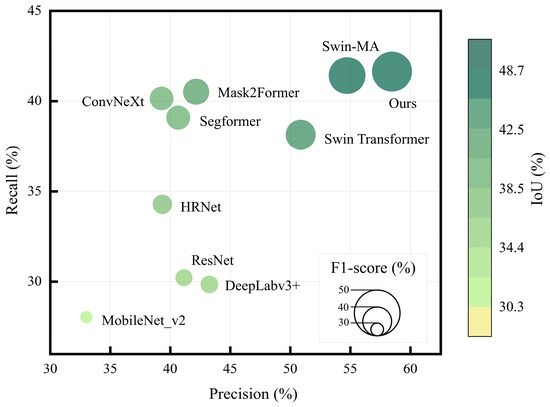 To further examine the trade-off between Precision and Recall, we visualized the model performances for the more challenging Hengduan Mountains dataset in the Precision–Recall space, as shown in Figure 9. The figure displays the distribution of various models, where bubble size represents the F1-score and color intensity indicates the IoU, with darker green denoting higher values. Conventional models are clustered in the lower-left area, reflecting limited Recall and IoU in complex terrain background. Transformer-based architectures shift toward the upper-right, indicating improved Recall, though some suffer reduced Precision due to background misclassification. In contrast, our method is positioned at the top-right, achieving both the highest Precision and Recall, along with superior IoU and F1-score. This demonstrates that the proposed spike-inspired sparse attention strategy enhances the model’s ability to capture more true landslides while suppressing false positives, delivering balanced gains across all key metrics.