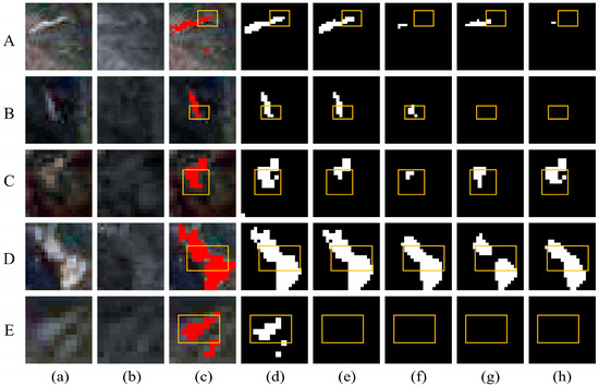 Visual comparison for different models in Hengduan Mountains. (a) Post-landslide image. (b) Pre-landslide image. (c) Ground truth. (d) Ours. (e) Swin-MA. (f) Segformer. (g) HRNet. (h) Deeplabv3+. Red pixels represent actual landslides. Black pixels represent the extracted background, while white pixels represent the extracted landslides. (A–E) Representative cases.
