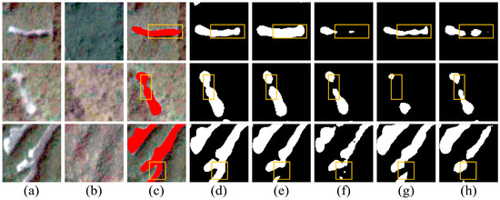 Visual comparison for different models in Hokkaido, Japan. (a) Post-landslide image. (b) Pre-landslide image. (c) Ground truth. (d) Ours. (e) Swin-MA. (f) Segformer. (g) HRNet. (h) Deeplabv3+. Red pixels represent actual landslides. Black pixels represent the extracted background, while white pixels represent the extracted landslides.