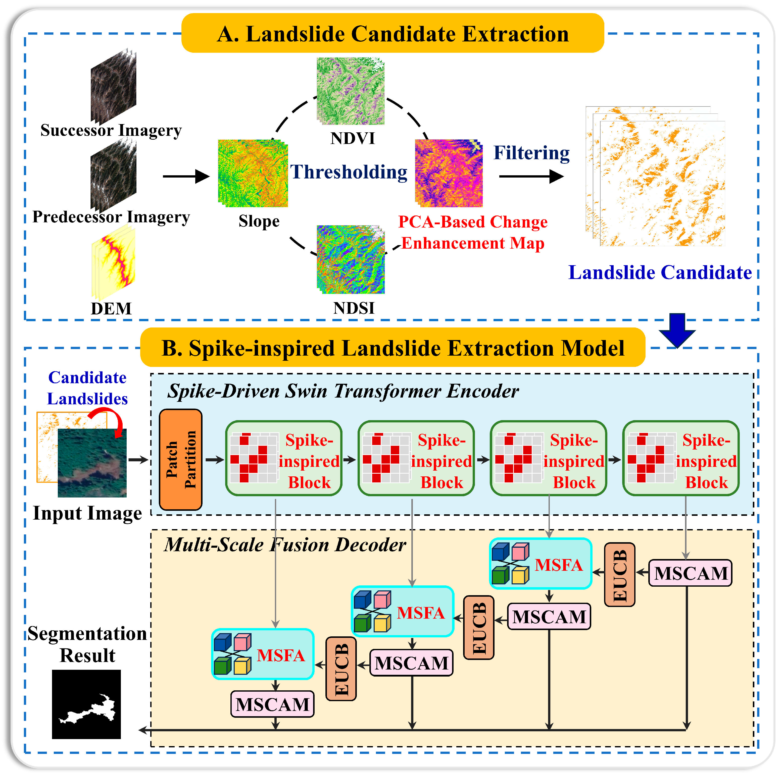 - A Spike-inspired Landslide Extraction Model is developed, incorporating a spike-inspired sparse attention module (SISA) and mix-scale feature aggregation (MSFA) to adaptively suppress background noise and enhance blurred landslide boundaries.