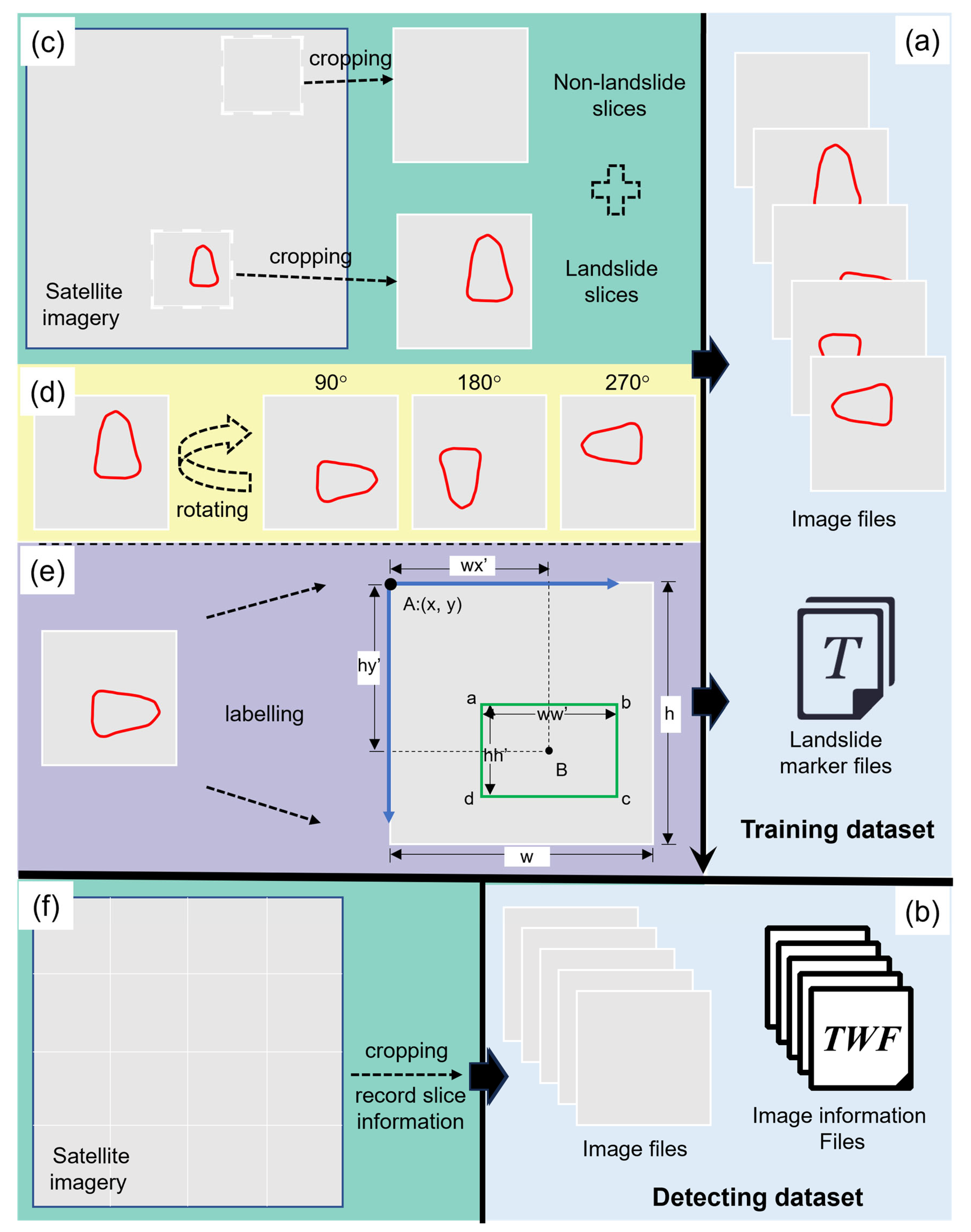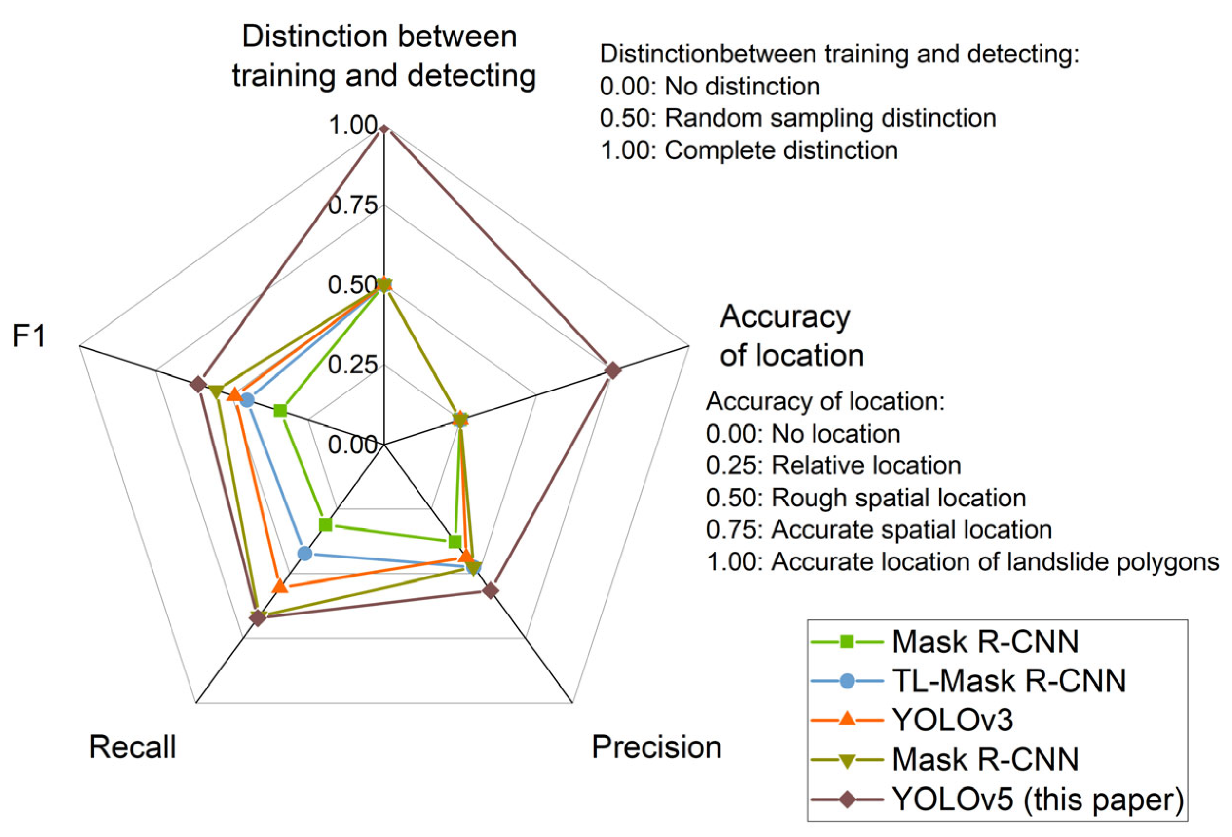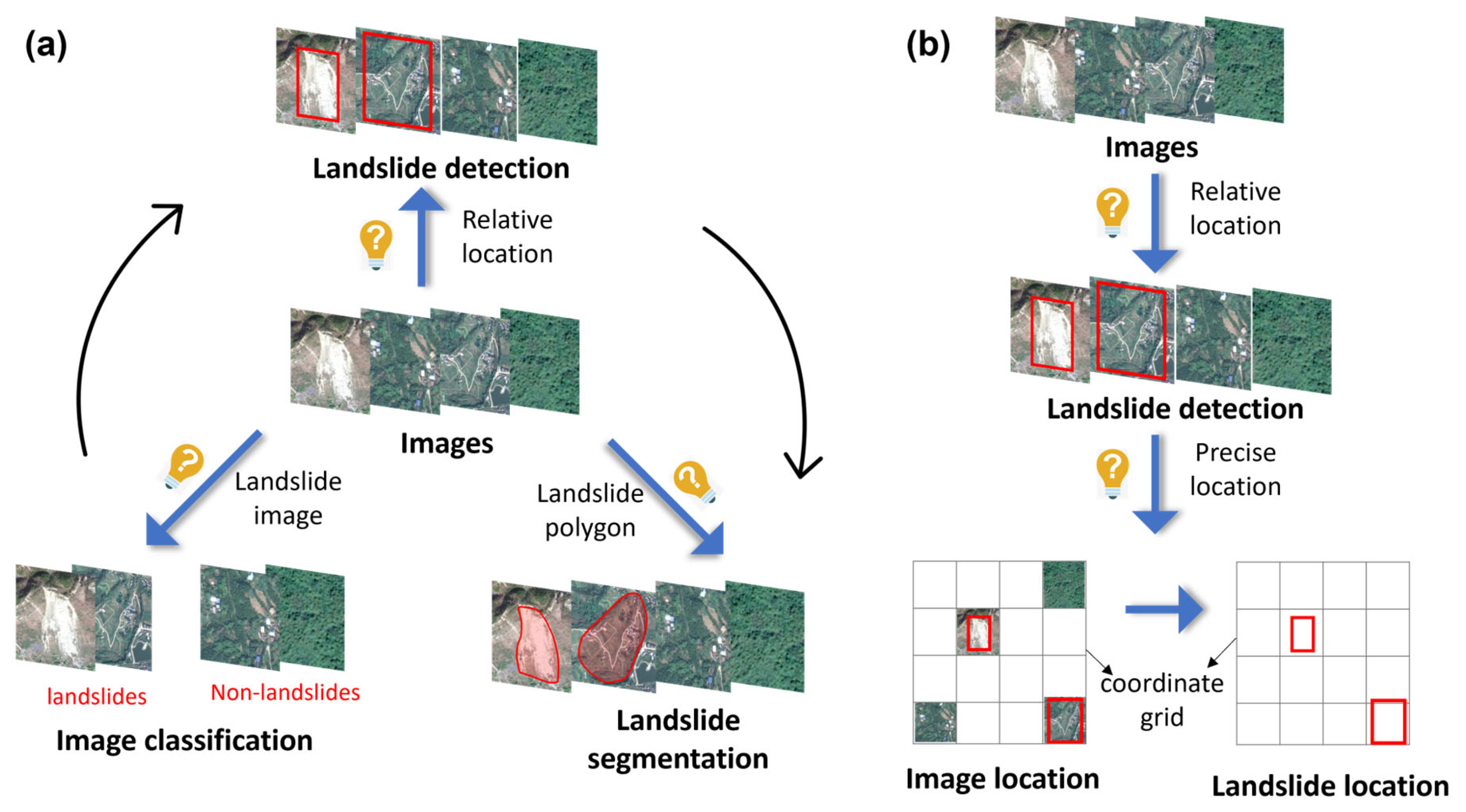 | Local Bounding Boxes | a box detects a local area of a landslide | Figure 7a | ![]() | +1 | +1 |