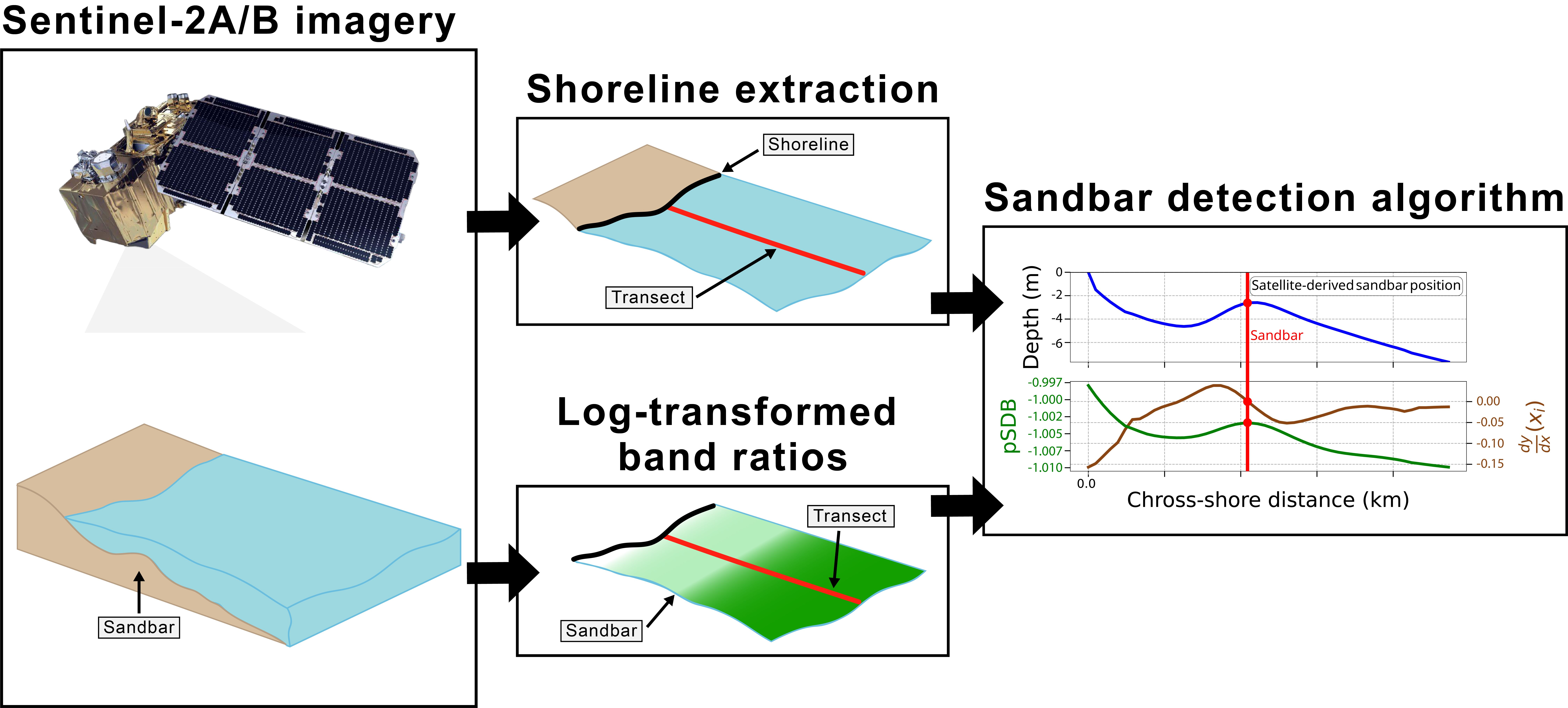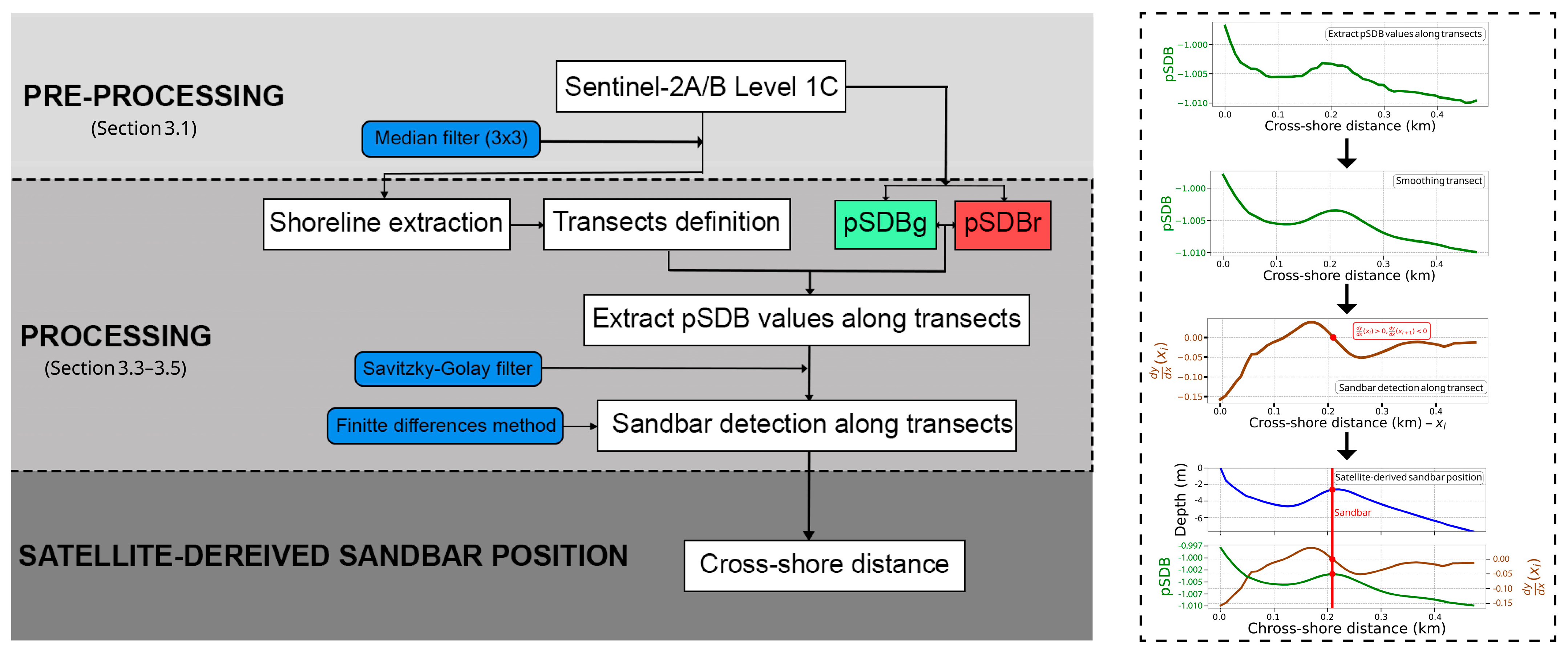 - The logarithmic band-ratio method applied to Sentinel-2 imagery accurately detects submerged sandbar crests across morphologically distinct Mediterranean beaches.