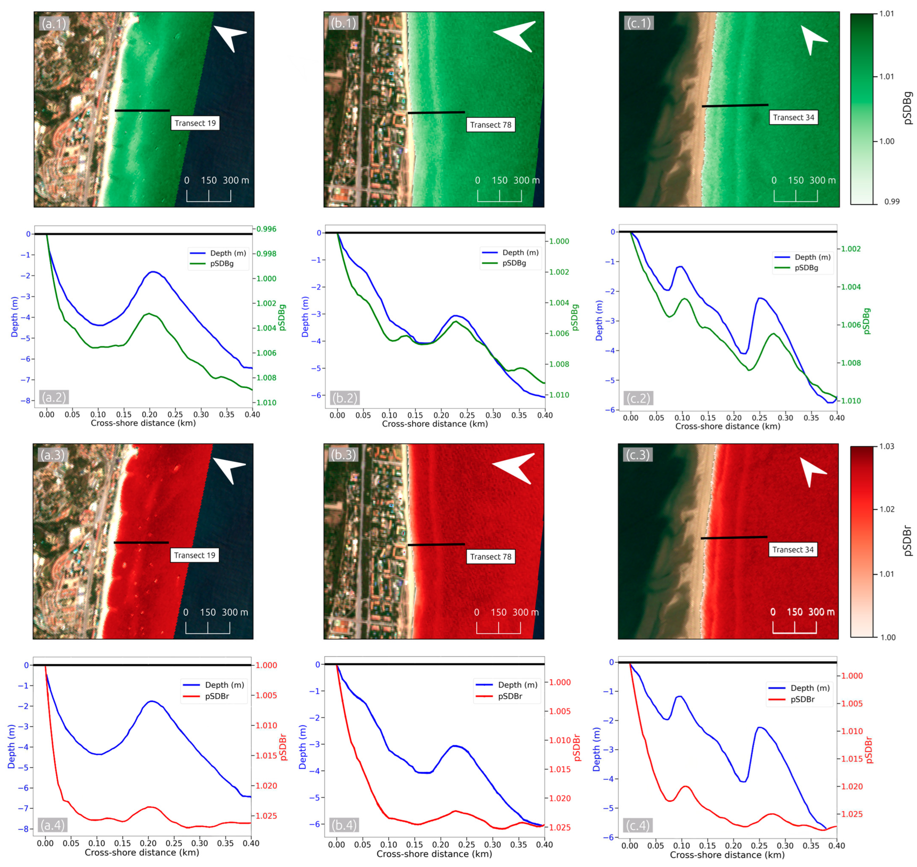 - Frugier, S.; Almar, R.; Bergsma, E.W.J.; Bak, S.A. Standalone Color-Based Bathymetry over 10 Years at Duck (NC, USA) from Optical Satellite Imagery and Wave Breaking Analysis. Coast. Eng. 2025, 203, 104855. [Google Scholar] [CrossRef]