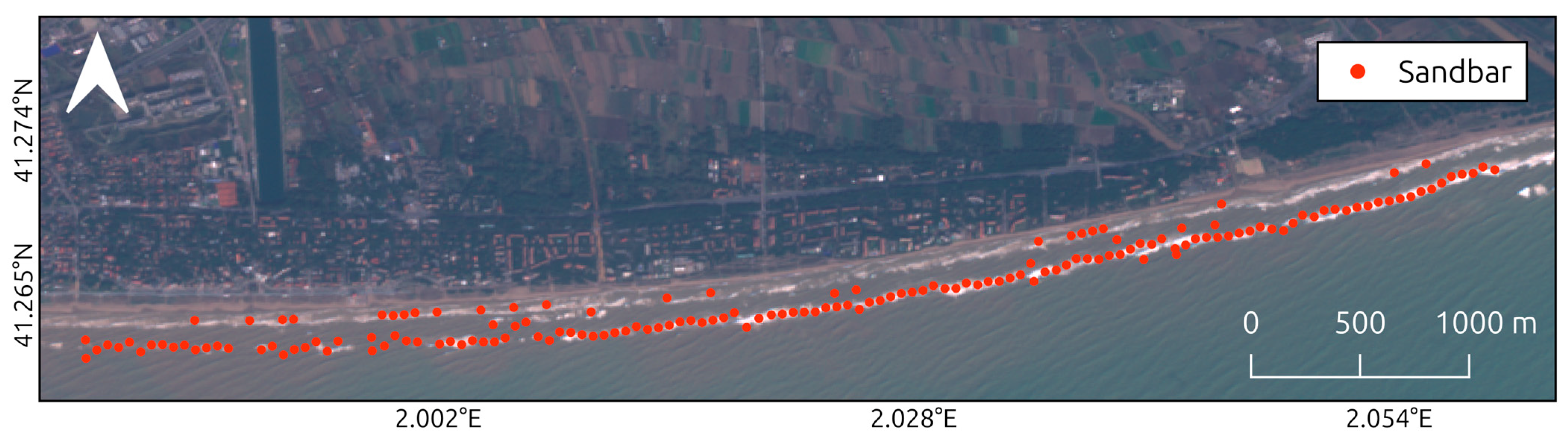 - Frugier, S.; Almar, R.; Bergsma, E.; Granjou, A. SBI: A Sandbar Extraction Spectral Index for Multi-Spectral Satellite Optical Imagery. Coast. Eng. 2025, 200, 104752. [Google Scholar] [CrossRef]