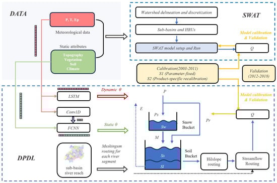 (2) Hydrological model setup and evaluation: The differentiable DPDL and SWAT hydrological models were set up for the Xiangjiang River Basin. Both models were calibrated using the first 9 years of the study period (1 January 2003 to 31 December 2011) and validated using the final 7 years (1 January 2012 to 31 December 2018).