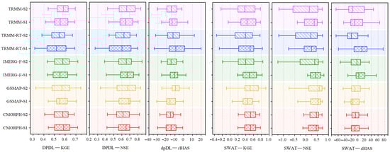 Analysis of Figure 5 indicates that the S2 strategy (product-specific retraining) can, to some extent, improve the median NSE and KGE of the DPDL model and narrow the performance gap between different SPPs. This confirms that through training, the model can learn product-specific biases and form a built-in “correction function”. However, for the RBIAS metric, the S2 strategy still underperforms the S1 strategy in most scenarios. Furthermore, the effect of the S2 strategy is not universally applicable to improving all metrics for every flood event, nor does it enhance the streamflow simulation accuracy for all precipitation products. This phenomenon is particularly evident in the SWAT model. For example, while the S2 strategy effectively improved the median NSE and KGE of streamflow simulations for TRMM and IMERG-F products in the DPDL model, it actually reduced accuracy in the SWAT model. For the CMORPH product, the S2 strategy failed to effectively improve its median NSE and KGE in either hydrological model. In summary, the advantages demonstrated by the S2 strategy in daily streamflow simulation are still partially reflected in event-scale flood simulation, but with notable differences.