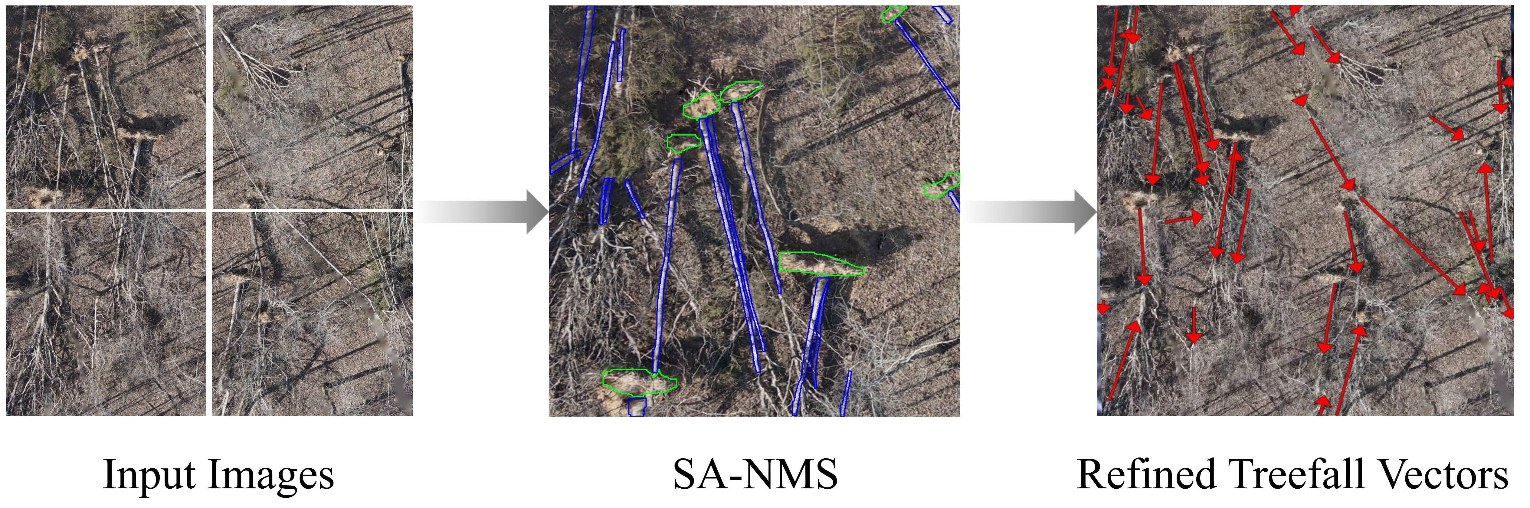 3]. The improved recall suggests that the shape-aware strategy used in SA-NMS better preserves complete treefall representations that might otherwise be fragmented or suppressed by conventional bounding confidence score-based NMS approaches. Notably, this increase in recall is achieved without a substantial reduction in precision, which is consistent with the intended design of the shape-aware post-processing framework.