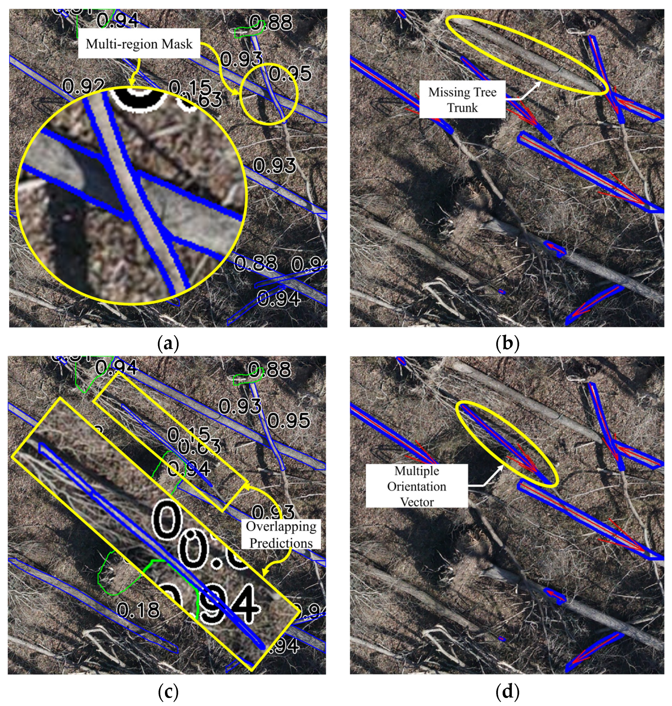 Figure 1c on a different instance in the picture. Duplicate predictions occurred frequently in natural imagery, particularly for elongated fallen trees with an overlapping arrangement. These duplicates increased the total object count and introduced errors in density-based analyses, where knowing the exact number of fallen trees was critical [