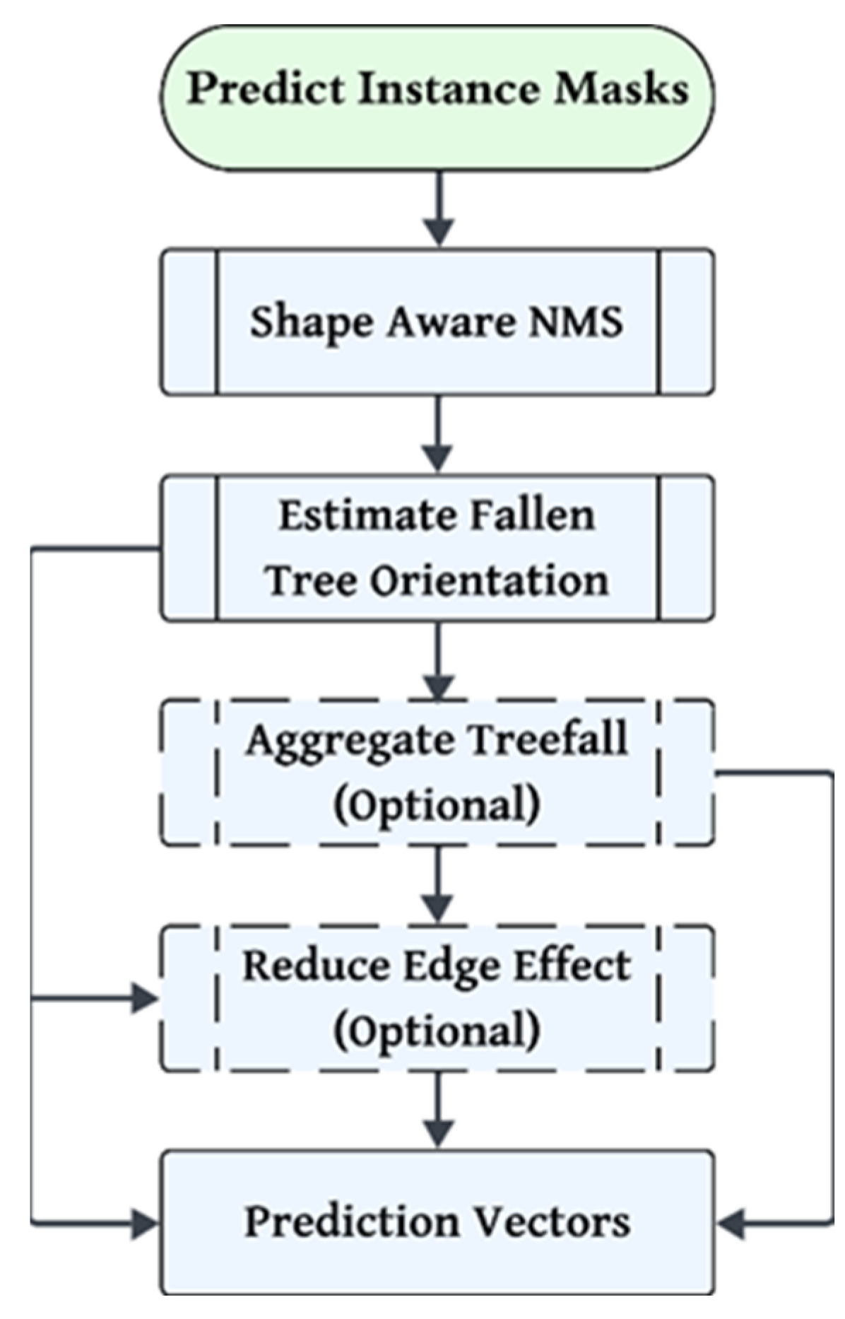 13]. As a result, they became the default choice in real-time deep-learning pipelines. However, they were insensitive to object geometry since they depended only on bounding-box or mask-level overlap, and often removed valid elongated detections in natural scenes. More importantly, these approaches only addressed the overlap problem and failed to merge fragmented masks. In forest imagery, this meant that two neighboring parallel fallen tree trunks could be misidentified as duplicates and one suppressed, even though both represented distinct objects.