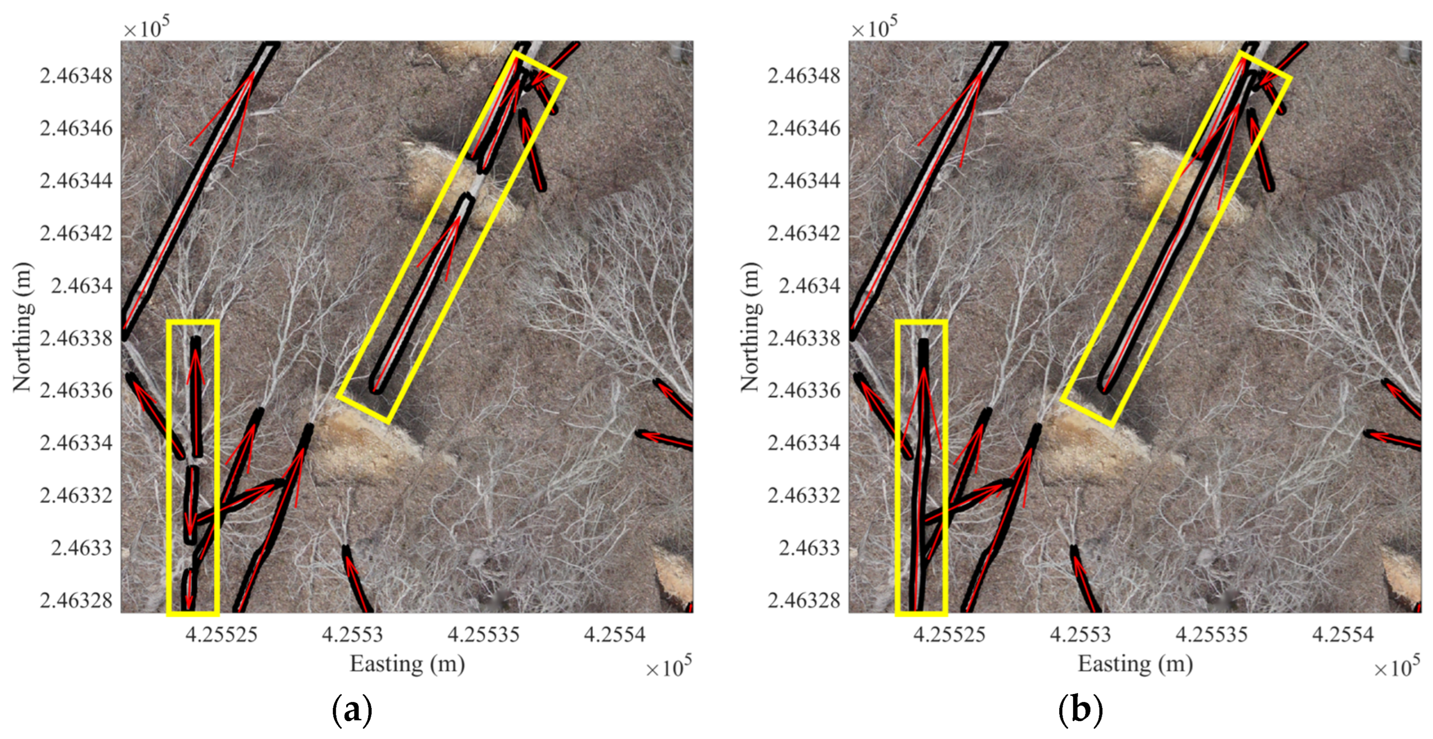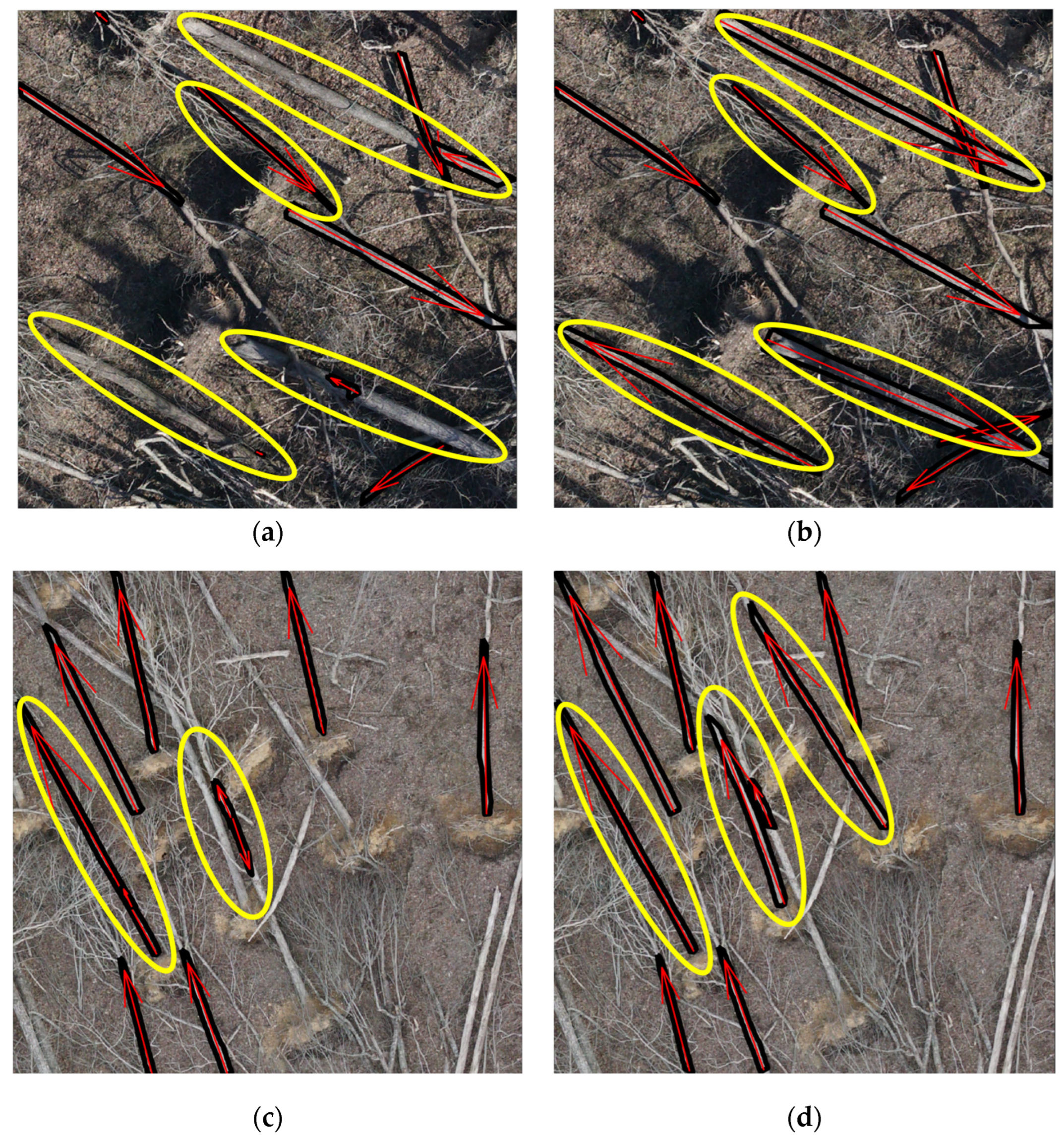 Figure 6 illustrates the effect of tree instance aggregation and its improvements. The black polygons represent tree trunk boundaries derived from detection, and the red vectors show the corresponding fall directions, both generated automatically. The yellow boxes, added manually for clarity, highlighted areas where noticeable changes occurred after aggregation.