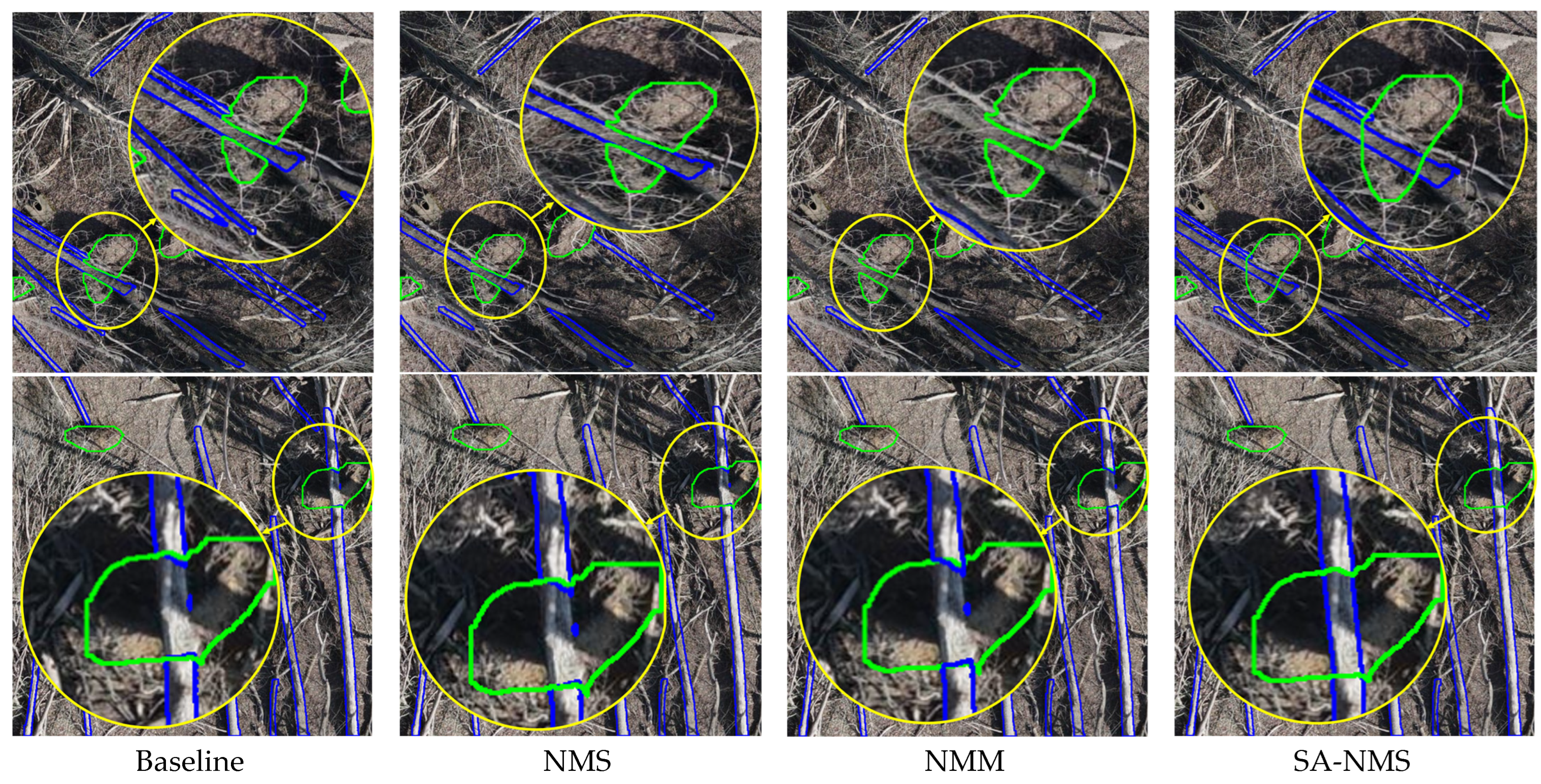 Table 4, recall increases substantially for both NT1 and NT7 following SA-NMS, with a slight improvement in precision. This indicates that many of the additional detections correspond to valid treefall or root ball instances that were previously fragmented in the baseline predictions. The separation of non-collinear fragments allows SA-NMS to recover distinct object instances that better align with the manually annotated ground truth. If the increase in instance count were dominated by false positives, a corresponding decrease in precision would be expected, which is not observed. In this table, the instance count (# Instance) value represents the final number of object instances retained in each processing stage.