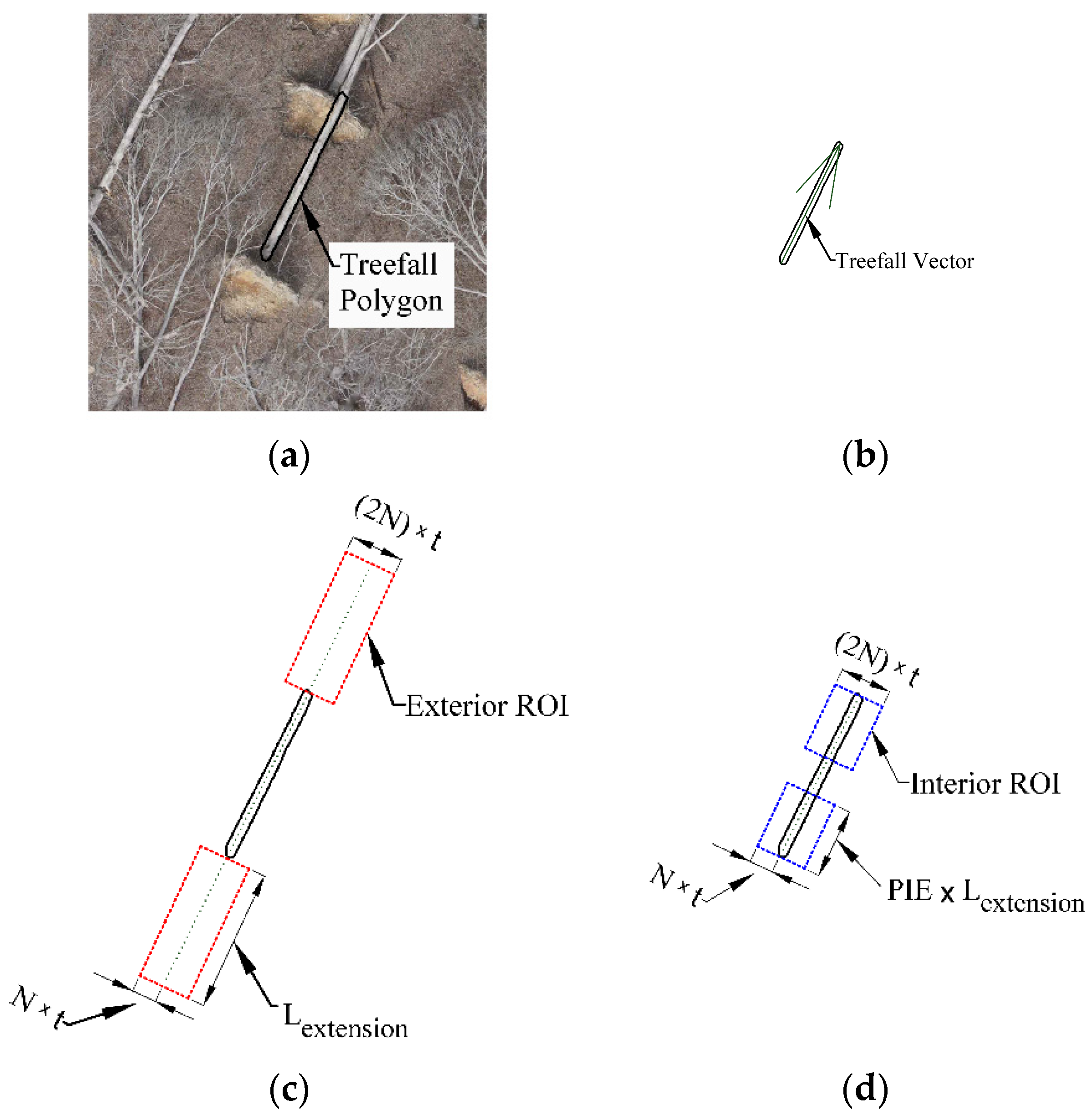 Section 3.3. For clarity, their formulations are not repeated here, but the same reasoning was applied to define the ROI around each candidate vector and determine whether separate fragments represented a single fallen tree.