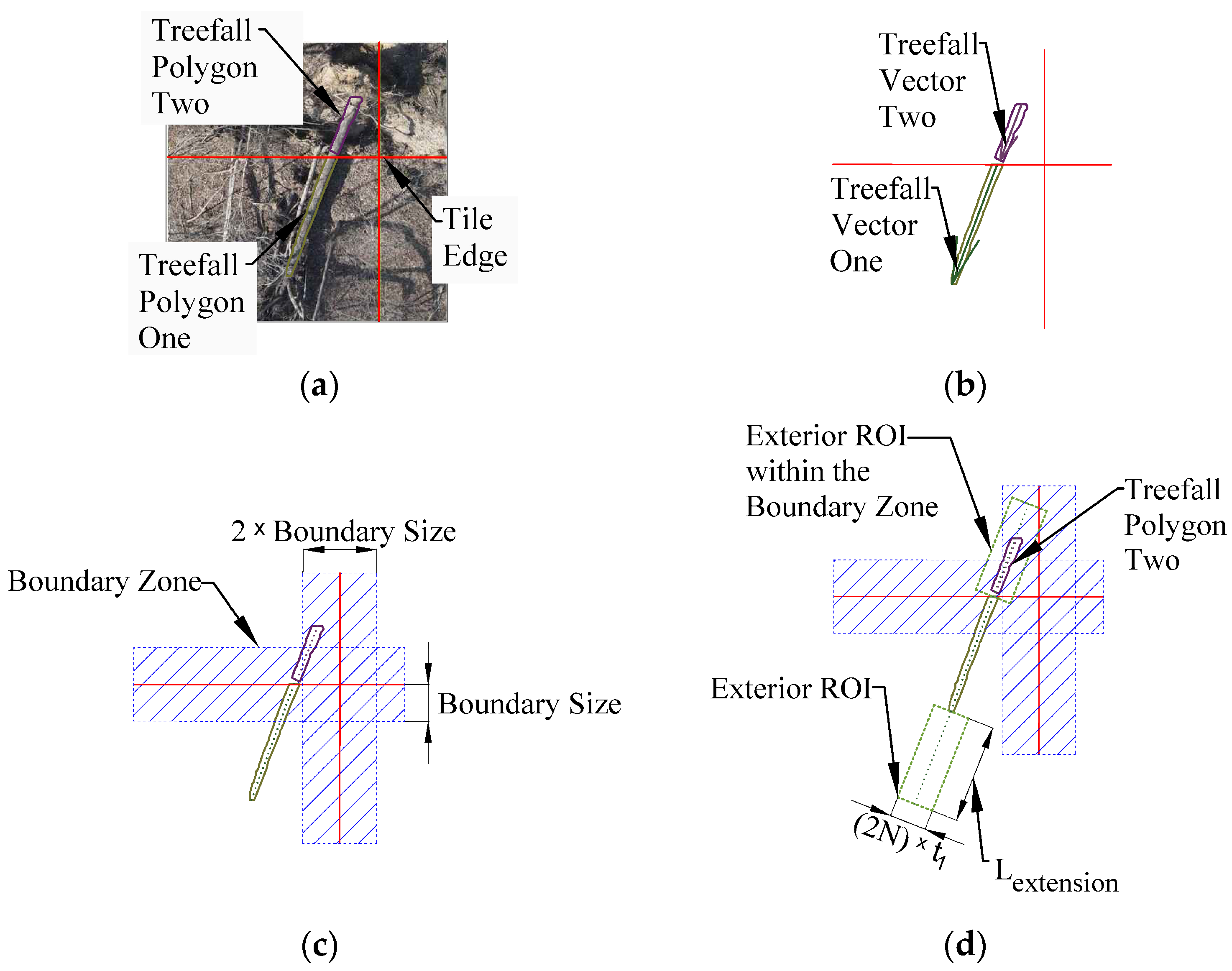 Figure 7 illustrates parameters used to generate the ROI for candidate treefall vectors during the boundary evaluation.
