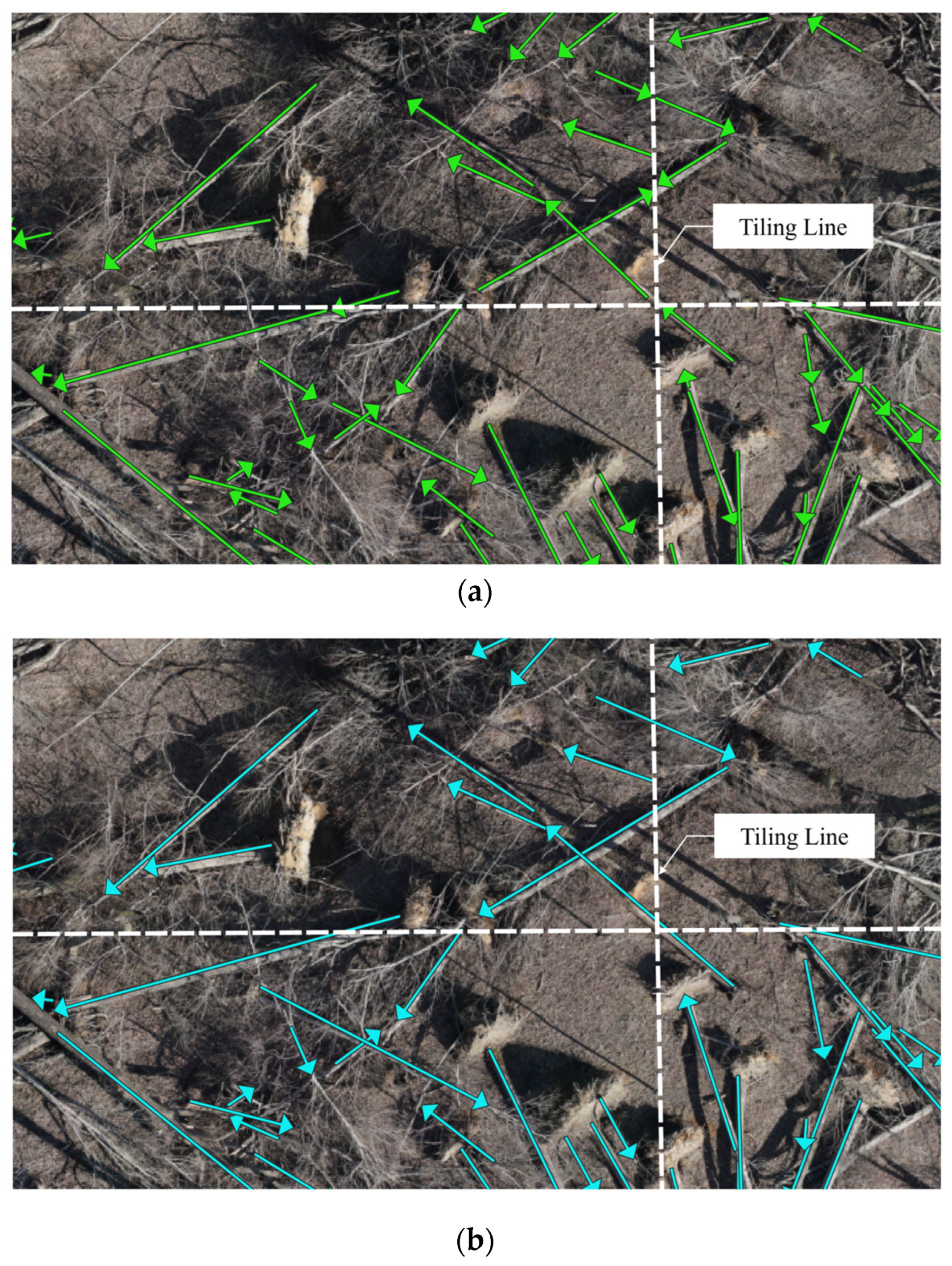 Figure 8 illustrates the improvements produced by the edge-effect reduction. In this figure, white dashed lines mark the vertical and horizontal tile boundaries. Green vectors represent prediction vectors before correction, and blue vectors indicate merged treefall vectors after edge-effect reduction. In