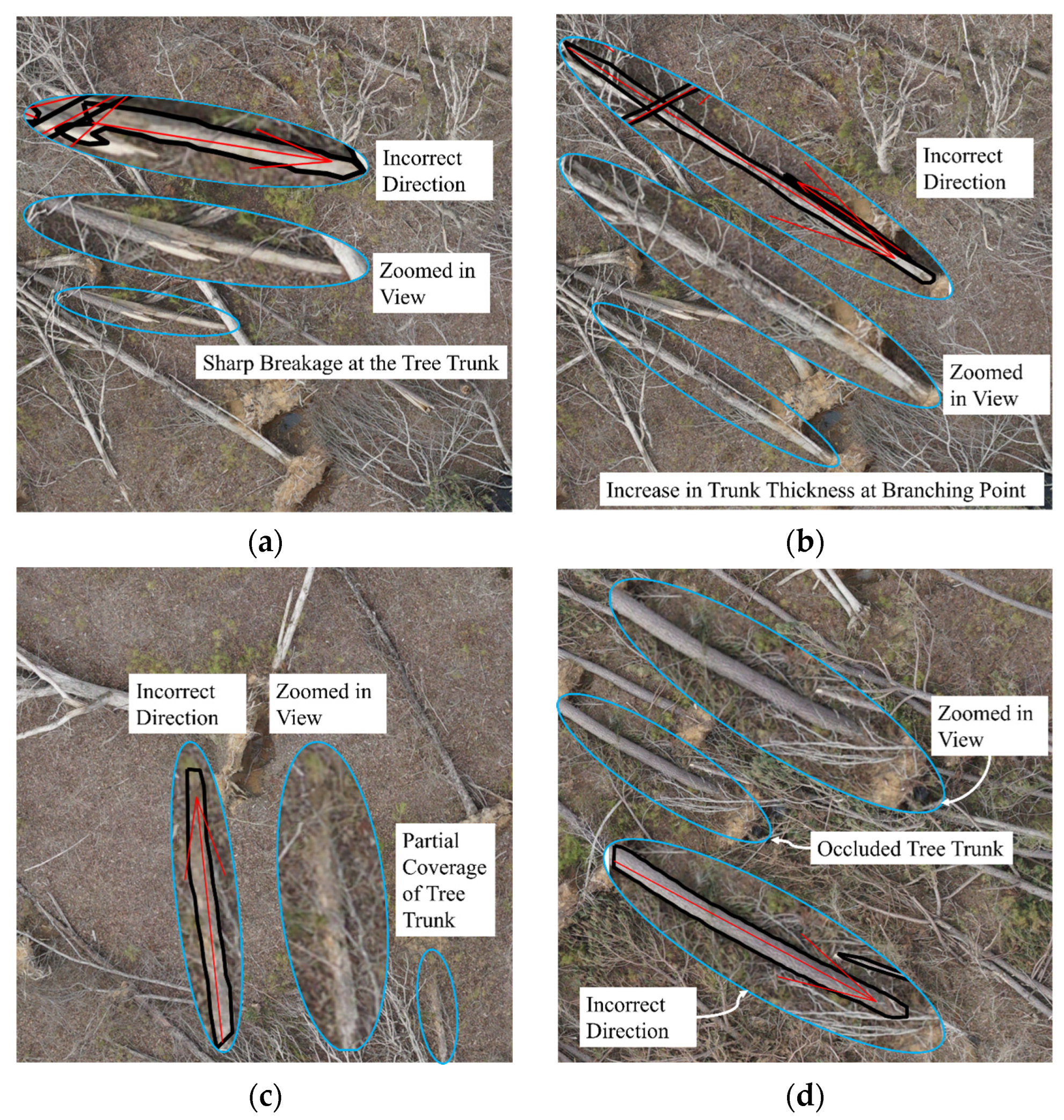 Figure 9 illustrates where the proposed method failed to estimate the correct fall direction due to irregular trunk shape or partial occlusion of the trunk.