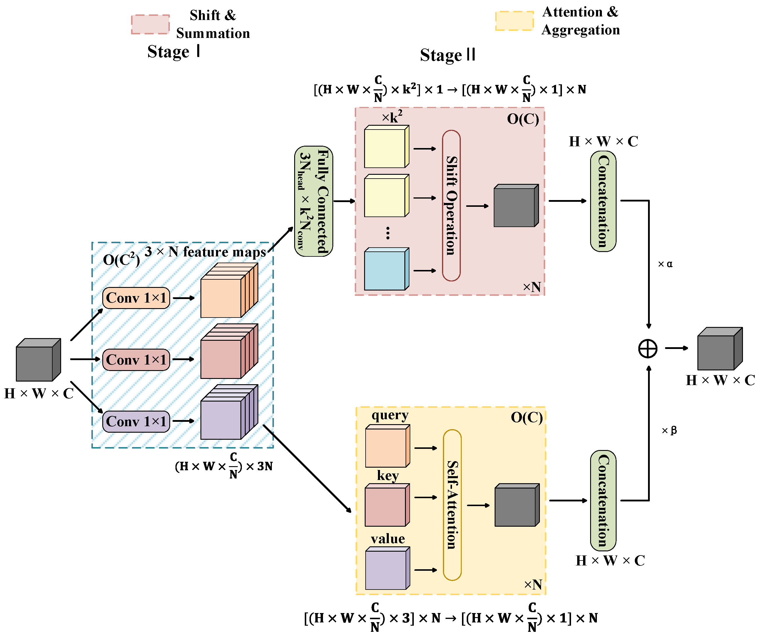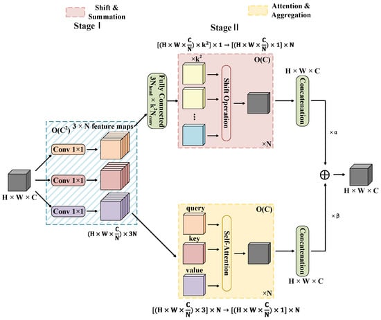 Figure 4, ACmix begins by projecting the input features into Query (Q), Key (K) and Value (V) tensors via three 1 × 1 convolutions. Q, K, V tensors are then processed along two parallel paths: a self-attention path, which reorganizes the tensors and computes attention-based aggregation, and a convolutional path, where the same tensors are reshaped and processed through fixed convolutional kernels. The outputs of both paths are summed, scaled by a learnable parameter, and combined with the input via a residual connection.