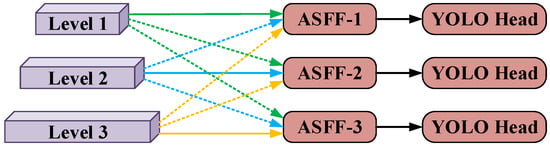 Here, , , and denote the input feature maps for level 1, level 2, and level 3, respectively. represents upsampling the level 2 feature map to the same dimensions as level1, with following the same principle. During the fusion process, the adjusted feature maps are multiplied by their corresponding adaptive weight parameters , and respectively. The weighted results are then summed to generate the final output feature map of the ASFF-1 module.