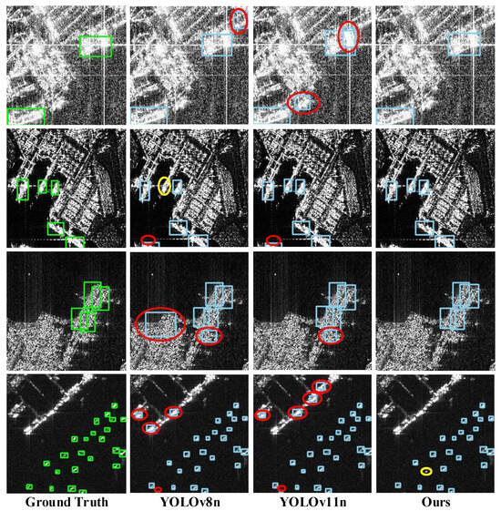 Figure 3, our enhancement mechanism strategically integrates ODConv’s four-dimensional dynamic properties at this critical juncture. The spatial dynamic weighting mechanism adapts to local deformations and azimuth variations in ship targets caused by imaging geometry. Channel dynamic attention autonomously enhances feature channels associated with strong scatter points on ships while suppressing channels contaminated by sea clutter or coherent speckle noise. The combined effects of filter dynamic combination and kernel size dynamic selection mechanisms collectively enhance the ability of the model to characterise the diverse scales and complex structures of ship targets. Therefore, C2f-ODConv is not merely an operator upgrade, but a purposeful design that embeds a dynamic perception mechanism at critical feature bottlenecks. It fundamentally enhances the feature extraction stage’s ability to address specific challenges in SAR ship detection, improving detection accuracy while maintaining a lightweight module.