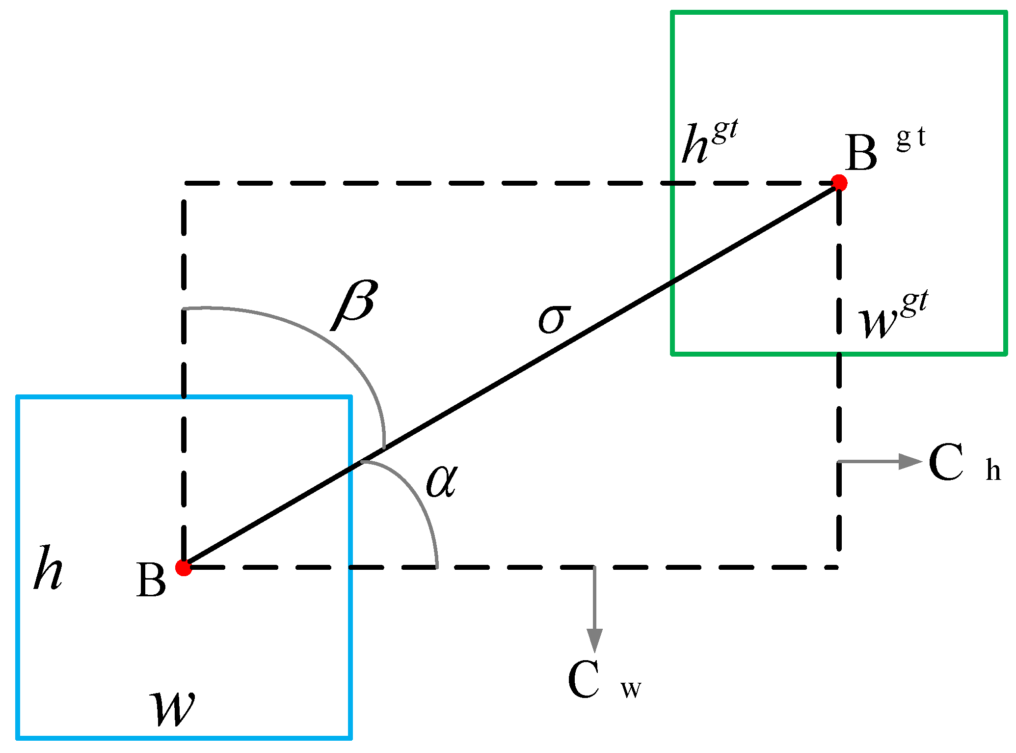 and denote the width and height of the ground truth bounding box, and denote the width and height of the predicted bounding box, and represents the degree of concern for shape cost.