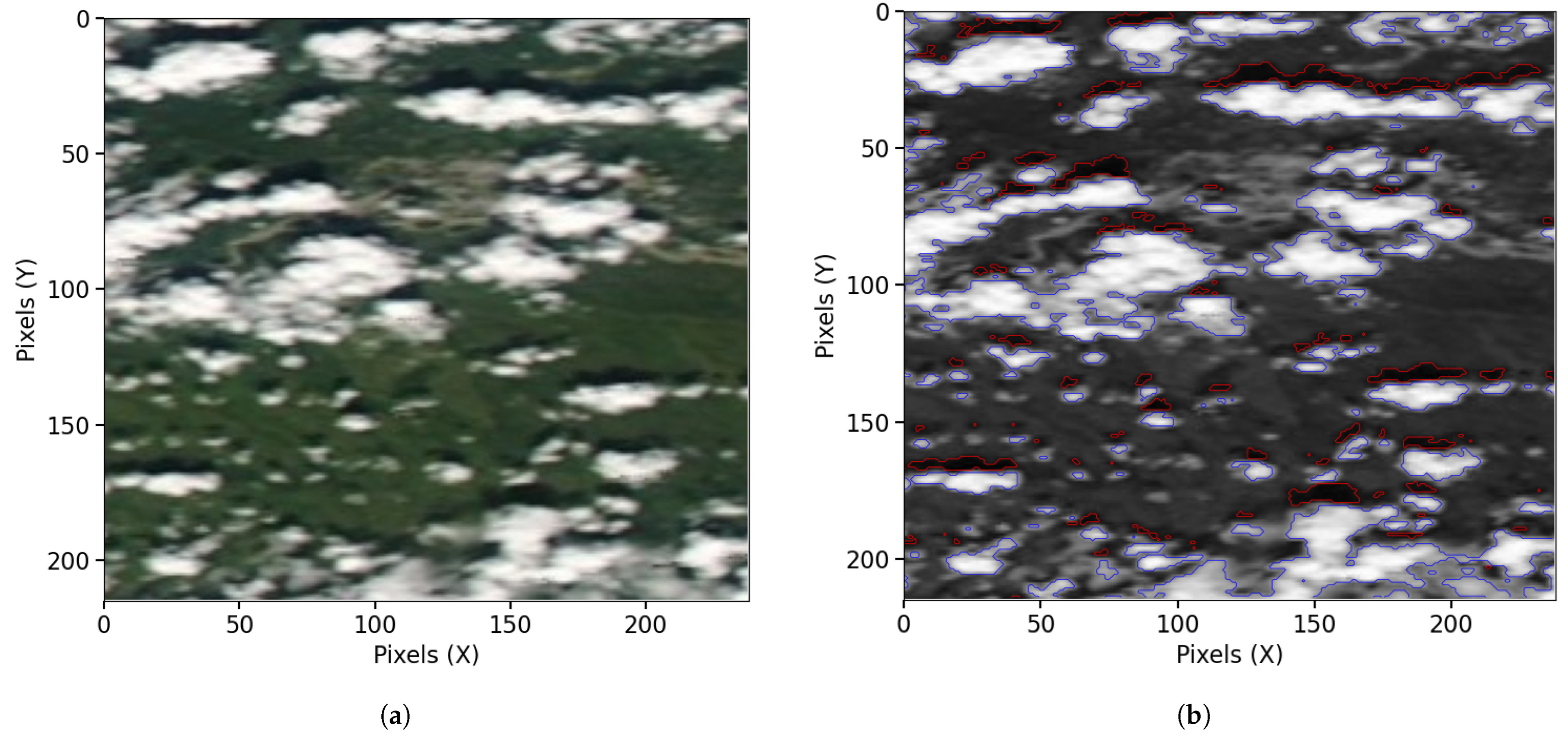 - Ibrahim, E.; Jiang, J.; Lema, L.; Barnabé, P.; Giuliani, G.; Lacroix, P.; Pirard, E. Cloud and Cloud-Shadow Detection for Applications in Mapping Small-Scale Mining in Colombia Using Sentinel-2 Imagery. Remote Sens. 2021, 13, 736. [Google Scholar] [CrossRef]