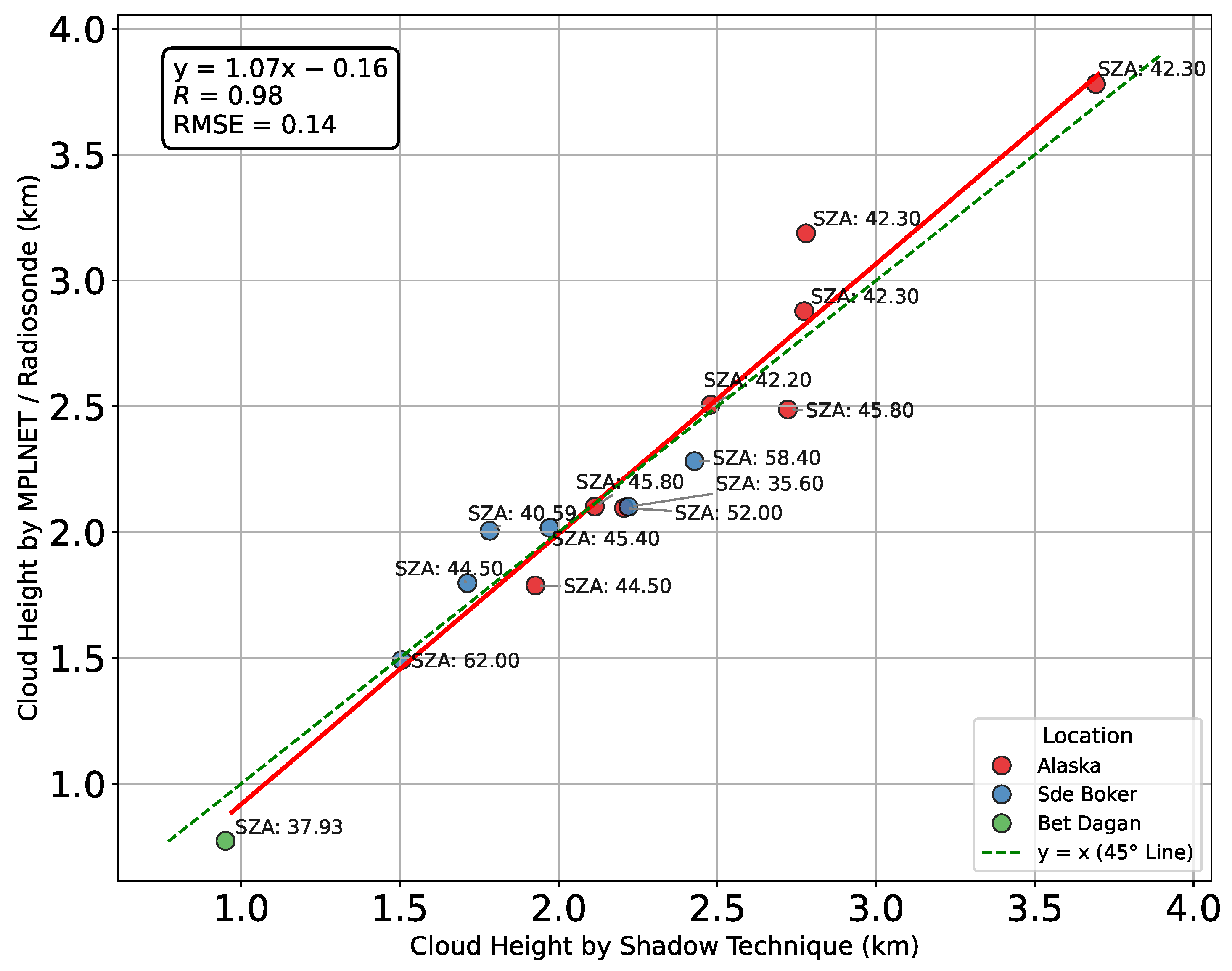 - A shadow-based geometric method accurately retrieves cloud and plume heights from single-view satellite imagery.