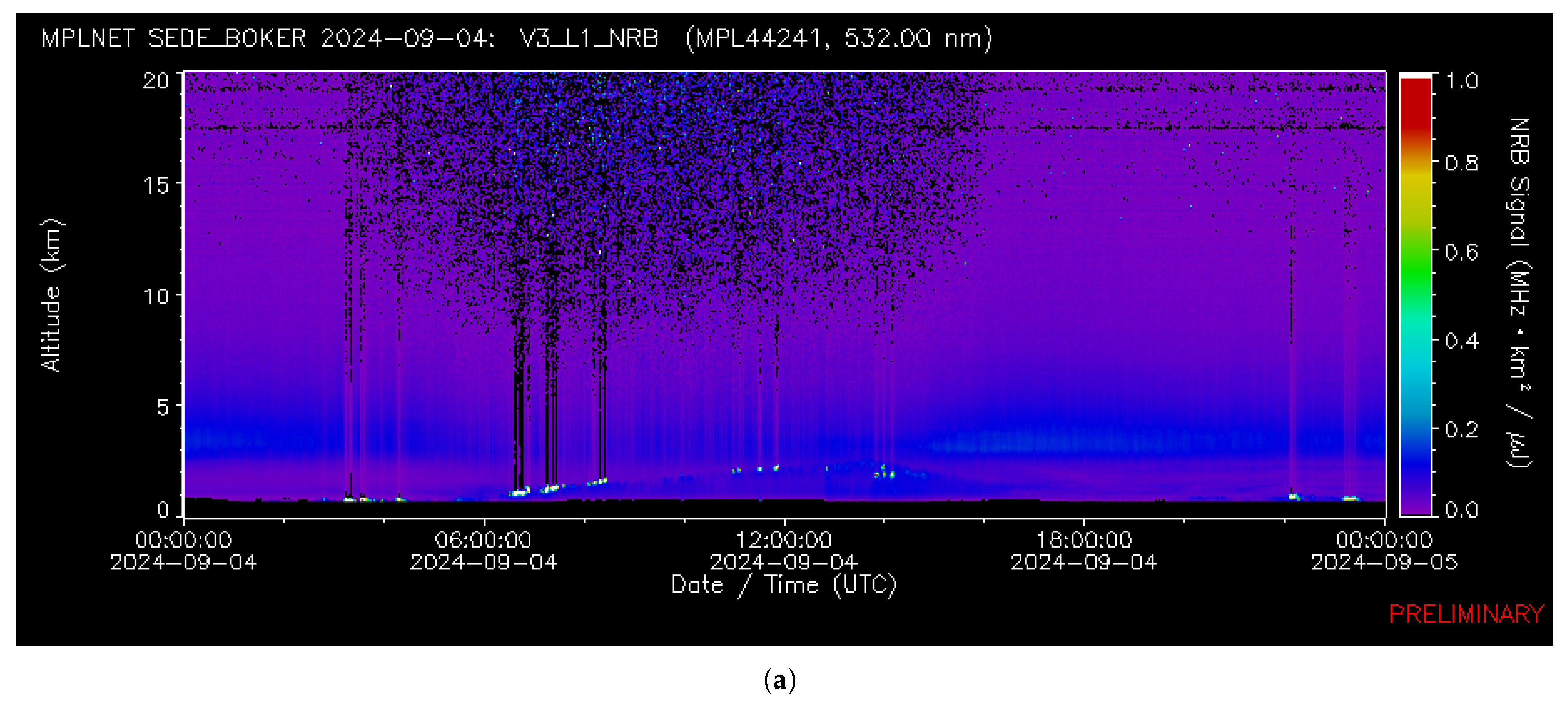 - The diurnal study uses the Sde Boker location instead of Fairbanks, Alaska, primarily due to differences in latitude. Being at a higher latitude, Fairbanks has MODIS images from Aqua and Terra satellites captured within 1 to 1.5 h of each other, whereas at Sde Boker, the time difference between images is about 3.5 h. This larger temporal gap allows for a clearer comparison of cloud formation between morning and afternoon. Table 2 illustrates the diurnal evolution of CBHs over Sde Boker on 4–21 September 2024. On both days, early morning (around 08:00 UTC) cloud bases were measured at approximately 1.5 km by MPLNET, followed by a noticeable increase during late morning (around 11:30 UTC) to 2.1 km on 4 September and 2.0 km on 21 September. These observations reflect the typical rise in CBH due to daytime boundary layer development. The consistent pattern across both days highlights the influence of surface-driven vertical mixing on cloud formation processes in arid environments under clear-sky conditions.