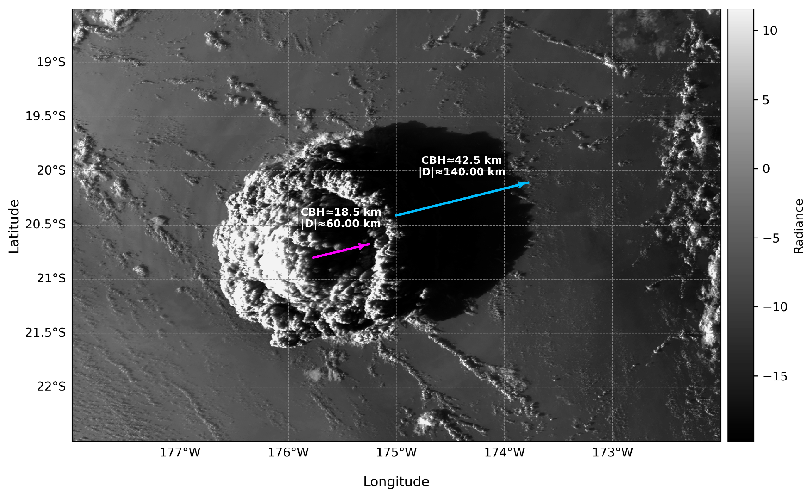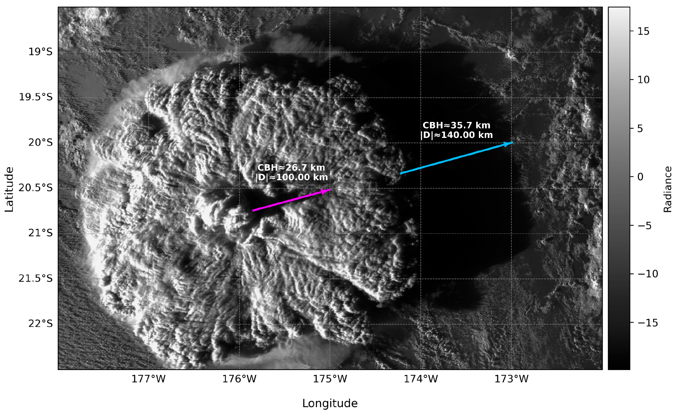 - Carr, J.L.; Horváth, Á.; Wu, D.L.; Friberg, M.D. Stereo Plume Height and Motion Retrievals for the Record-Setting Hunga Tonga–Hunga Ha’apai Eruption of 15 January 2022. Geophys. Res. Lett. 2022, 49, e2022GL098131. [Google Scholar] [CrossRef]