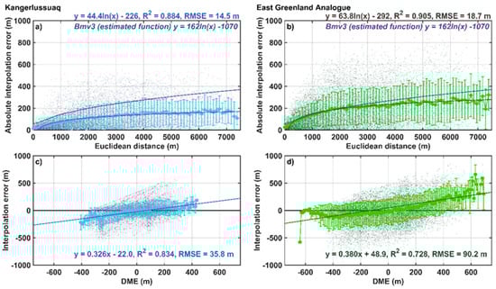 For individual interpolation errors, the Euclidean distance of an interpolated cell from an input did not correlate with the absolute error (R2 = 0.197). Furthermore, the Euclidean distance showed no correlation with the real value for the error. We found the correlation to strengthen when the mean interpolation error was computed for every 150 m of distance (Figure 3a: R2 = 0.884 and p = 4.27 × 10−33; Figure 3b: R2 = 0.905 and p = 6.08 × 10−36; and Figure 4a: R2 = 0.952 and p = 6.60 × 10−34). As the gridded output for our sites and BedMachine was posted at 150 m, no accuracy was lost by grouping distances into 150 m intervals. Notably, the mean interpolation errors were consistently below the function applied to the distance from an input for Bedmachine (Figure 4a, purple line). While some errors exceeded this, 91% fell below the function line. Accordingly, the function established from these results predicted reduced uncertainty for all interpolation locations further than 1600 m from an input location compared with BedMachine.
