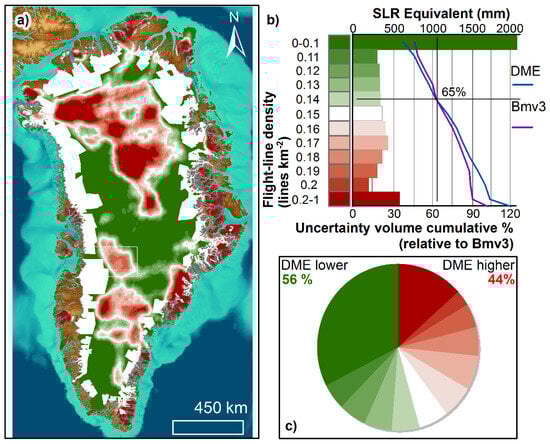 Flight-line density within a 50 km search window (lines km−2) across the kriged area of BedMachine. (a) Mapped flight-line density, green shows where DME–error function is predicted to reduce uncertainty with respect to Bedmachine, and red is vice versa. (b) Bar chart shows the amount of sea-level rise (SLR) equivalent estimated in each region using BedMachine; lines show the cumulative percentage of the uncertainty volume (uncertainty in elevation multiplied by area) at each flight-line density for DME (blue) and BedMachine (purple). (c) Pie chart shows representative areas of each flight-line density class; the sum of green segments is the area where the DME uncertainty is likely to be lower than that for BedMachine. Background colours depict topography: sea floor is shown in shades of blue (dark = low; light = high) and land surface in shades of brown (light = high; dark = low).