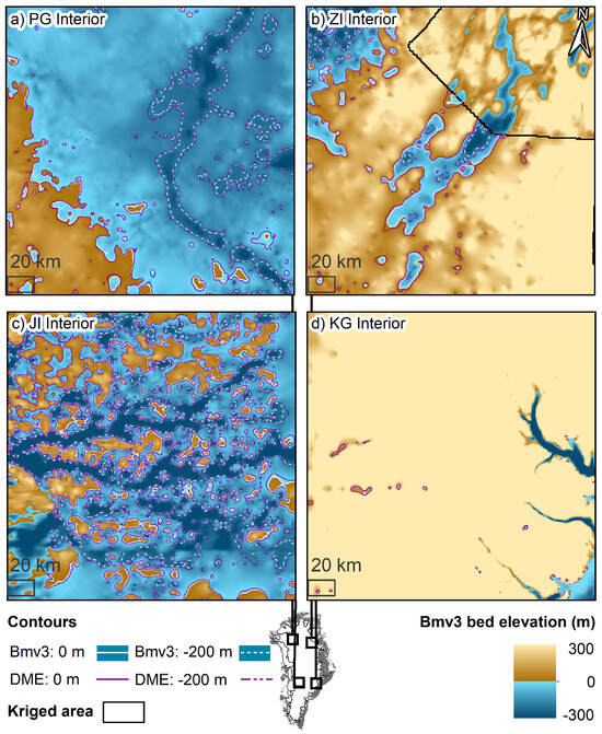 Although it can be reasonably assumed that neighbouring expanded deeper areas are connected, our results do not show this (Figure 8). As our results predominantly modified kriged bed topography in the vertical domain, they did not improve the horizontal connectivity of deep basins; hence, “bullseye”-like interpolation artefacts still exist in the dataset (Figure 8; ref. [24]), which remain a challenge for ice sheet modelling studies. While our method does not remove interpolation artefacts that hinder accurate numerical modelling [38], estimates of the sea-level rise contribution would still be greater than the unmodified dataset purely from the deepening of the bed [28]. Though the interior portion of the GrIS is unlikely to contribute to sea-level rise in the current century [39], these findings have implications for our appreciation of the stability of the GrIS in the far future [48]. Nevertheless, isostatic uplift of the bed with deglaciation will act to alleviate this, and it is uncertain how ocean temperature and circulation will evolve on these longer timescales [48].