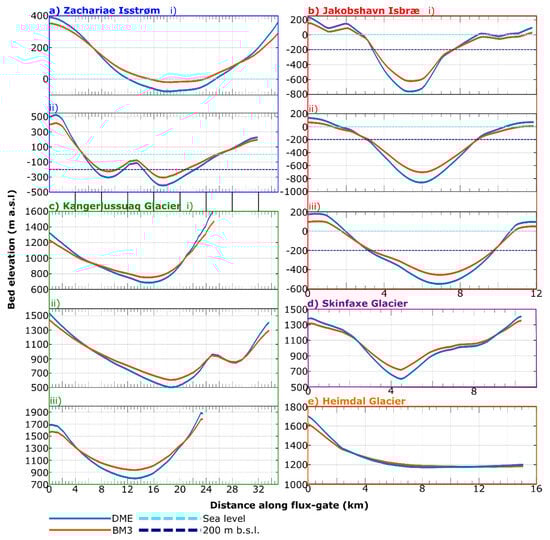 Comparison of Bedmachine (orange profiles) and DME (blue profiles) altered flux-gate bed elevation cross-sections for major outlet glaciers (labelled in Figure 6). (a) Zachariae Isstrøm: (i) North and (ii) South; (b) Jakobshavn Isbræ: (i) North, (ii) Central, and (iii) South; (c) Kangerlussuaq Glacier: (i) North, (ii) Central, and (iii) South; (d) Skinfaxe Glacier; and (e) Heimdal Glacier.