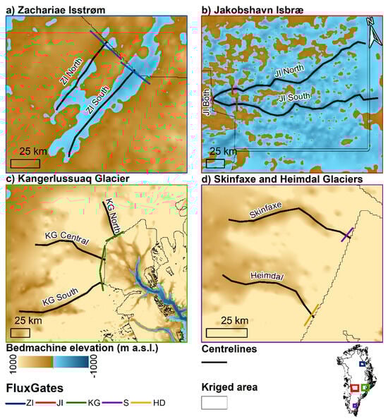 Map of centreline and flux-gate bed elevation profile locations highlighted in Figure 10 and Figure 12. (a) Zachariæ Isstrøm flux-gate and centreline locations, (b) Jakobshavn Isbræ flux-gate and centreline locations, (c) Kangerlussuaq flux-gate and centreline locations, and (d) Skinfaxe and Heimdal flux-gate and centreline locations.