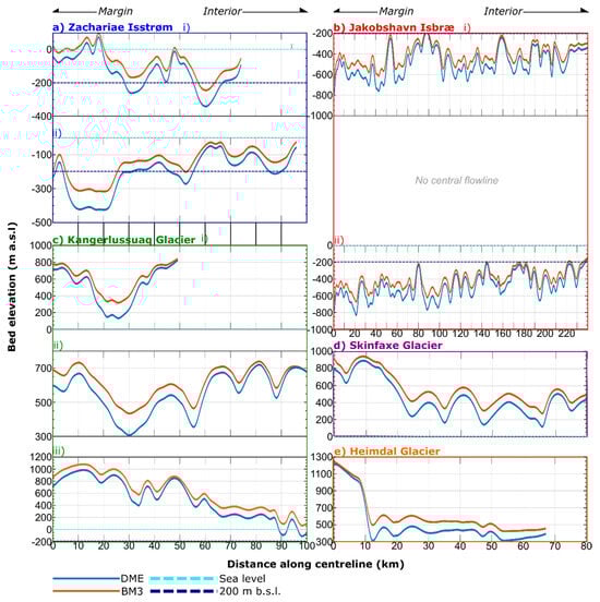 Comparison of BedMachine (orange profiles) and DME (blue profiles) altered centreline bed elevation cross-sections for major outlet glaciers (labelled in Figure 6). (a) Zachariae Isstrøm: (i) North and (ii) South; (b) Jakobshavn Isbræ: (i) North and (ii) South; (c) Kangerlussuaq Glacier: (i) North, (ii) Central, and (iii) South; (d) Skinfaxe Glacier; and (e) Heimdal Glacier.