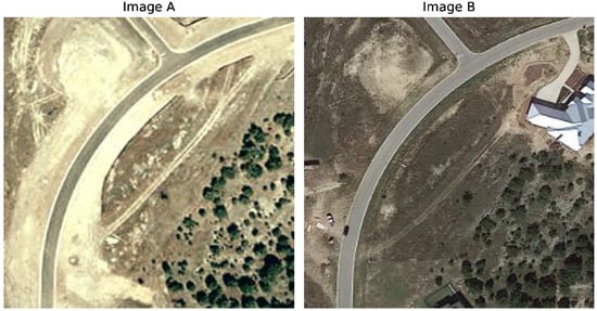 Example of an incorrect prediction on the test set (image: test_000096.png). Image A earlier acquisition and Image B later acquisition. GT: A villa appears on the side of the road on the right. Pred: The scene is the same as before.