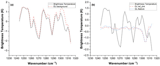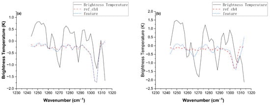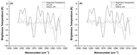 Comparison of methane feature extraction performance using the LASSO method under different humidity conditions with a fixed methane concentration. (a) Low-humidity scenario (RH = 5%). (b) High-humidity scenario (RH = 70%). The black solid line represents the simulated brightness temperature spectrum, the red dashed line indicates the reference spectrum selected by the LASSO algorithm, and the blue dashed line denotes the extracted methane feature. The detection accuracy, quantified by the correlation coefficient () calculated according to the method described in [13], significantly degrades from 0.98 in the low-humidity case to 0.80 in the high-humidity case due to the spectral distortion caused by water vapor interference.