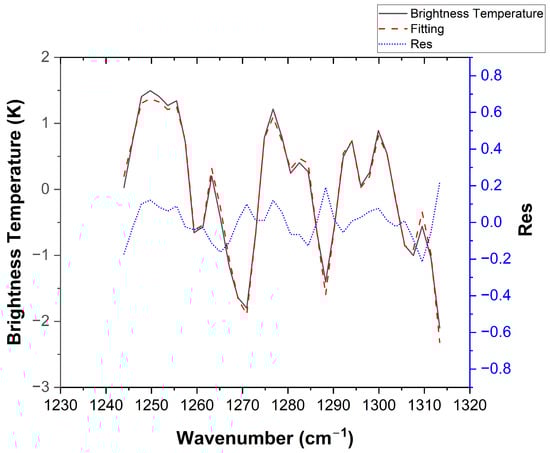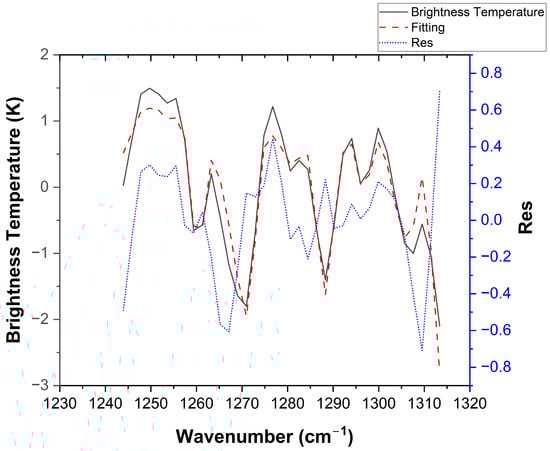 Spectral fitting results of the proposed method. The left vertical axis displays the brightness temperature, corresponding to the black solid line (simulated measurement spectrum) and the red dashed line (fitted spectrum). The right vertical axis indicates the fitting residual (blue dashed line, labeled as Res), which is calculated as the difference between the simulated and fitted spectra (i.e., ). The use of a dual-axis scale allows for a clear visualization of the low-magnitude residuals against the high-magnitude spectral baseline.