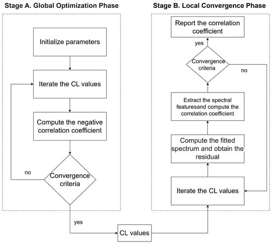 Flowchart of the D-LM algorithm. The process comprises two stages: Stage A represents the global search using the differential evolution (DE) algorithm, and stage B represents the local fine-tuning using the Levenberg–Marquardt (LM) algorithm.