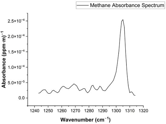 To ensure robust detection stability against sensor noise, we specifically selected the spectral window ranging from 1243.95 to 1313.37 cm−1 (as shown in Figure 7). Although the central peak exhibits the strongest absorption, relying solely on a narrow peak makes the inversion highly susceptible to high-frequency noise and baseline drift. In contrast, the selected broad window captures a continuous spectral structure, including both the primary peak and the characteristic side-lobes. This multi-feature morphological constraint allows the fitting algorithm to distinguish the target methane signal from random noise and background interferences more effectively, thereby enhancing the inversion accuracy.