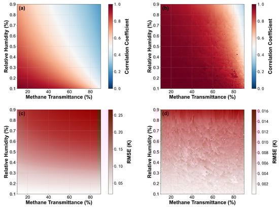 To quantitatively evaluate algorithm performance, multi-variable combination simulation experiments were constructed. Using methane transmittance and air relative humidity as variables, each equally divided into 100 discrete intervals within the 10–90% range, 10,000 test samples were generated through grid combinations, calculating values and the MSE of fitting residuals (as shown in Figure 8). To explicitly isolate the impact of relative concentration changes between methane and water vapor, factors such as baseline drift, instrument line shape (ILS), and random noise were excluded from this simulation.