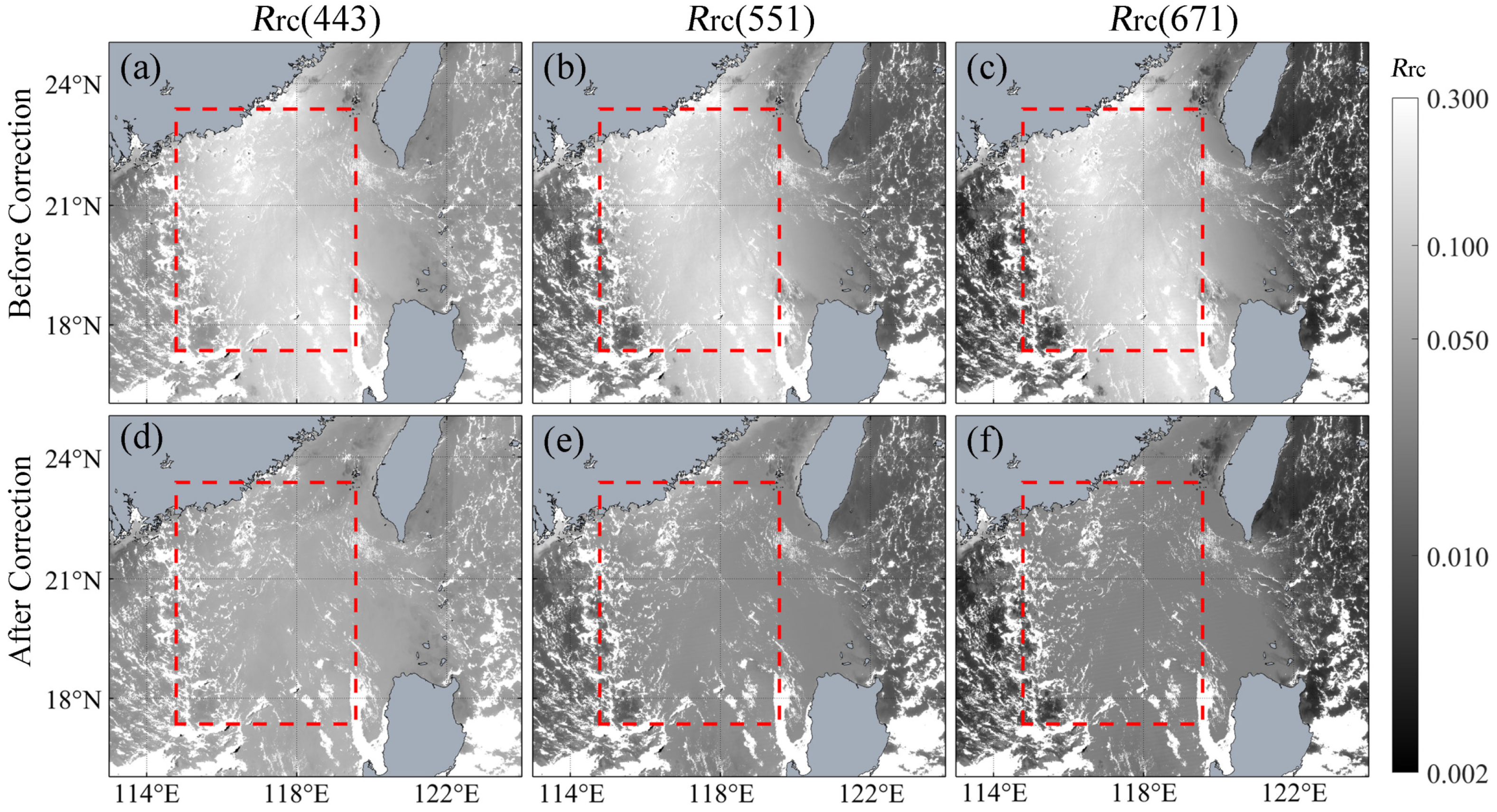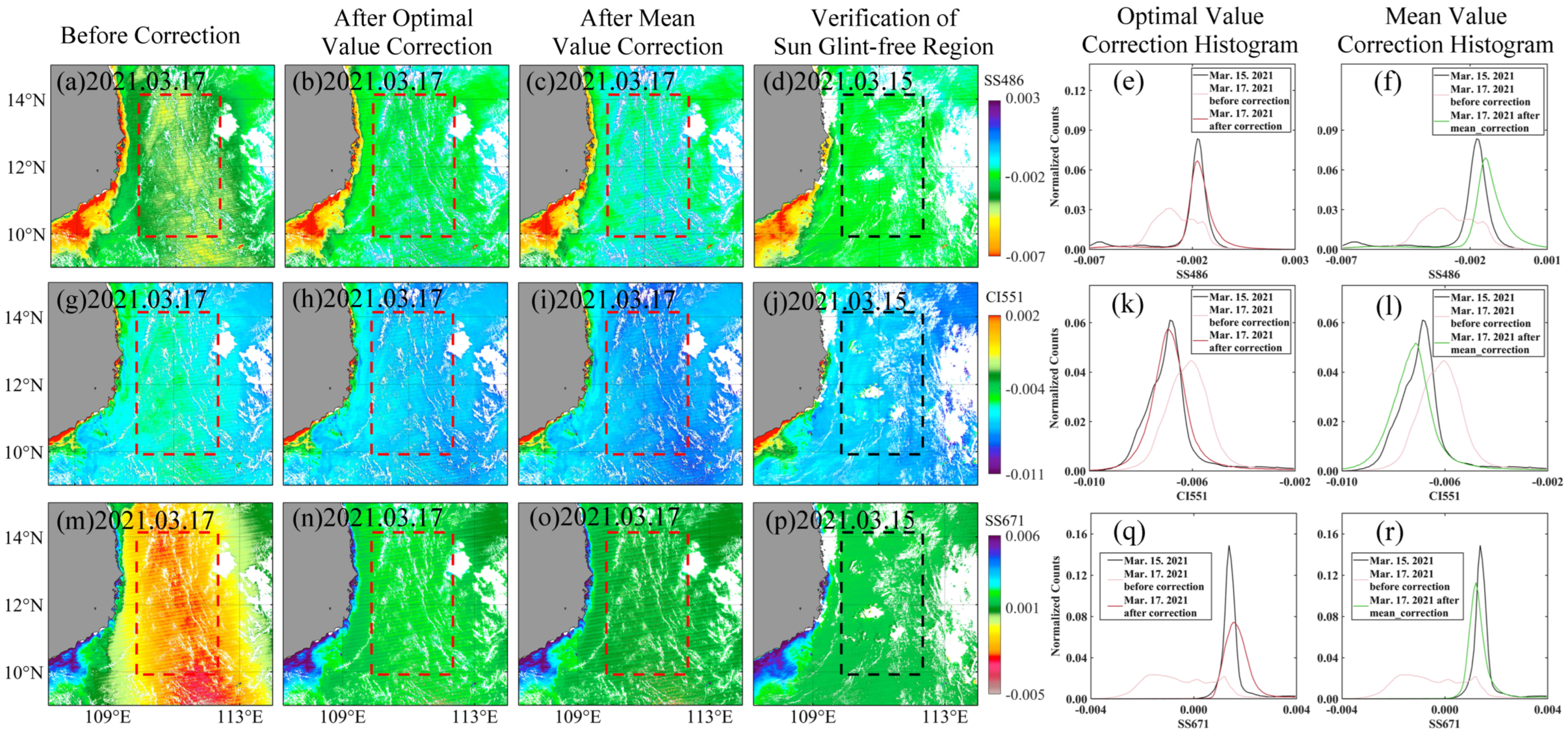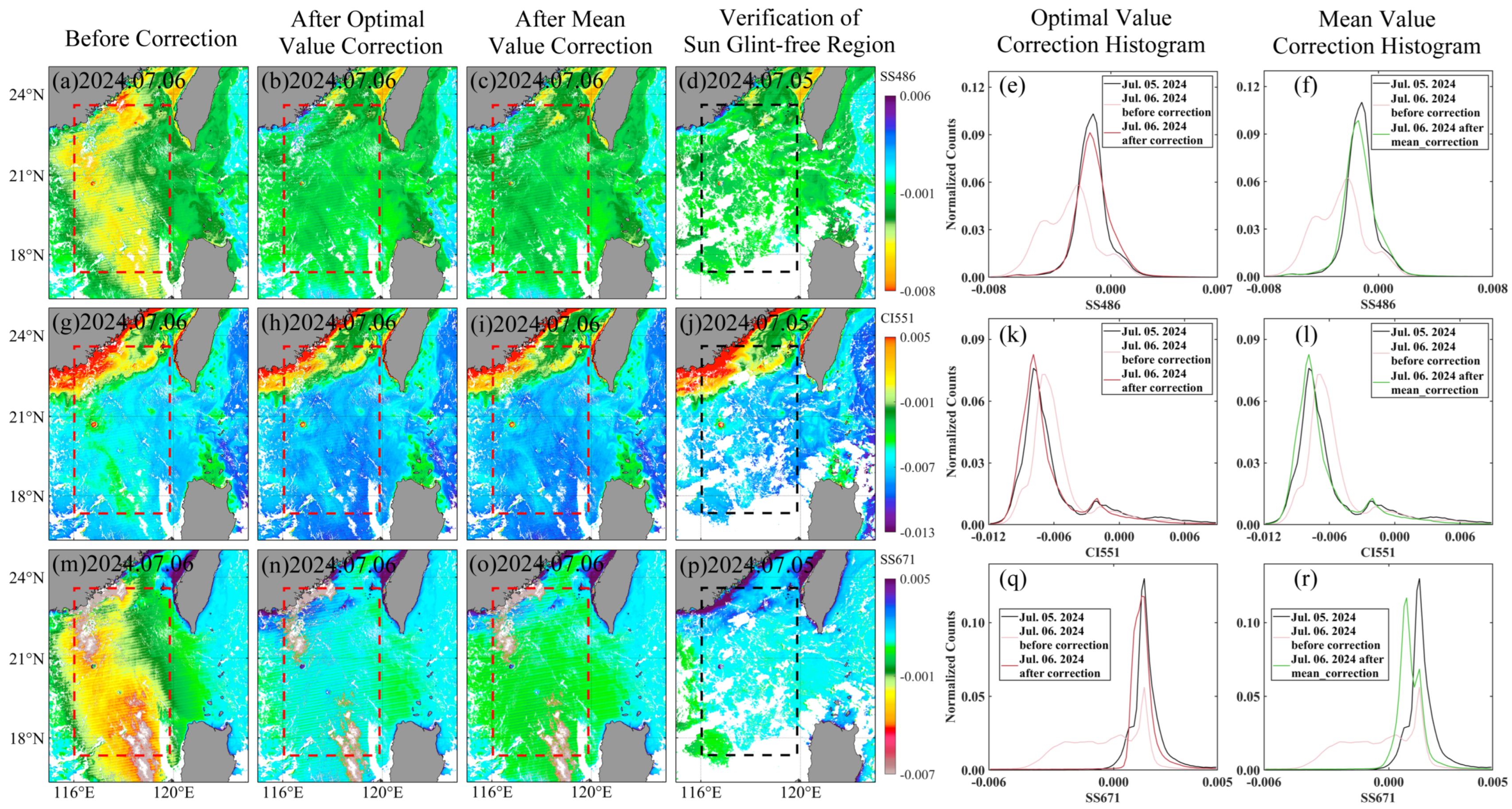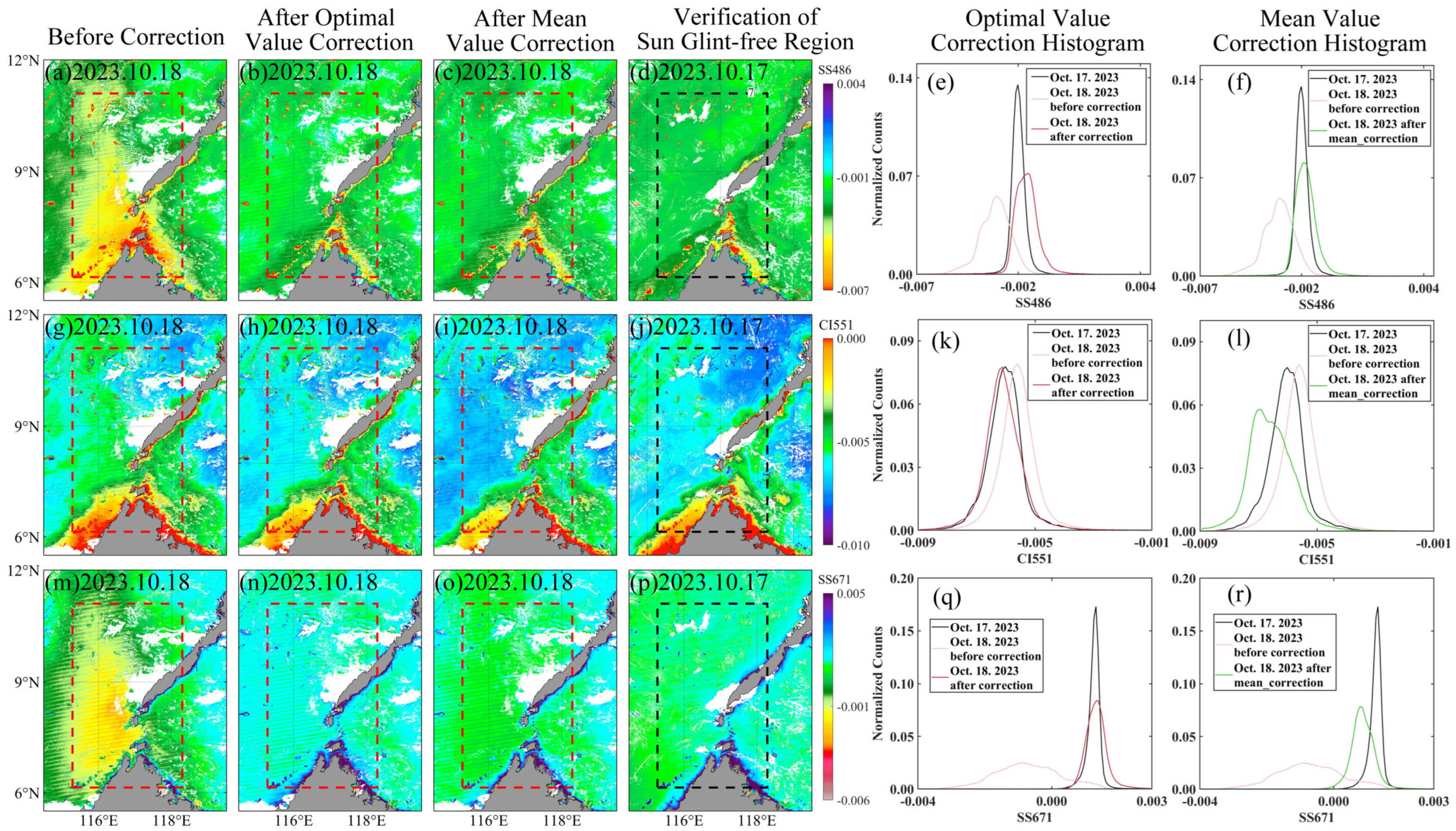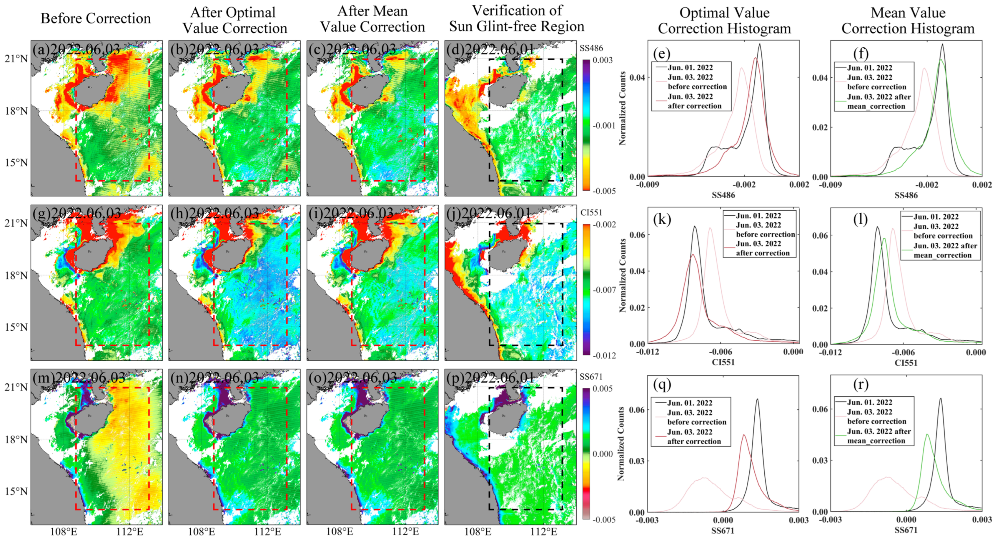 - Both the optimal-value and mean-value correction approaches exhibit strong robustness and transferability across different seasons and low-latitude marine environments. The optimal-value method generally achieves higher correction accuracy, but its reliance on temporally proximate glint-free reference imagery introduces operational constraints. In contrast, the mean-value method is more efficient and operationally flexible, making it suitable for broader application;